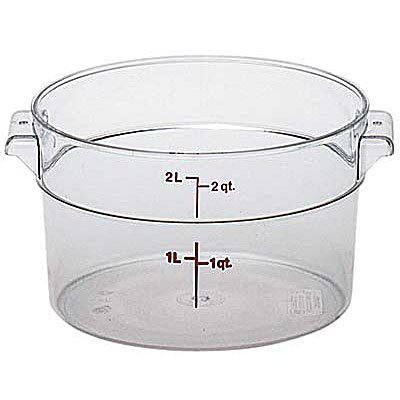 Use to store ingredients or transport ready-to-serve or partially prepared foods. Round shape promotes proper air circulation around the container. Easy to read imprinted graduations on the outside for inventory at a glance. Molded-in holes in the handle for quick and sanitary drying. Snap on covers fit tightly, yet can be easily removed. Made of crystal clear, virtually unbreakable Camwear polycarbonate. Withstands temperatures from -40 to 160 F. Stain-resistant to food acids and oils.