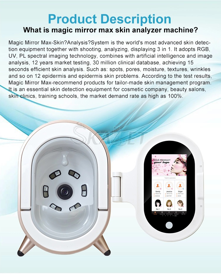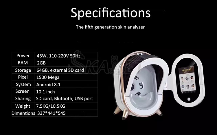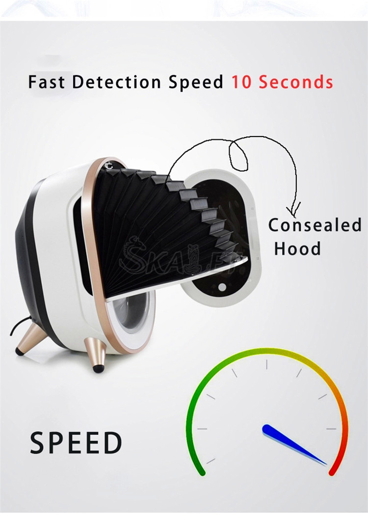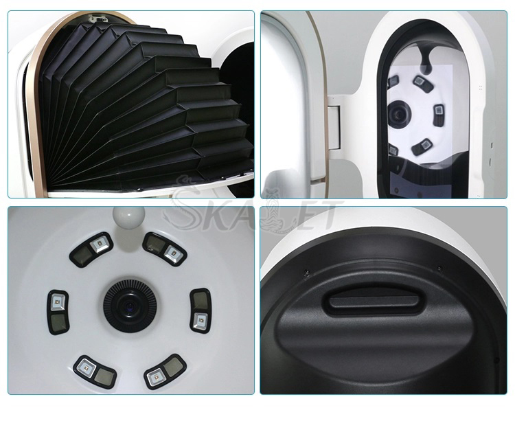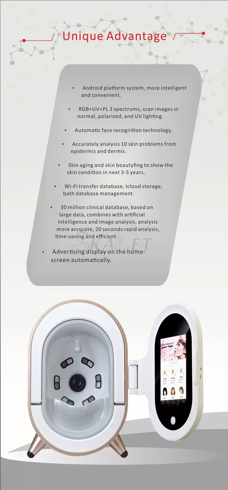 The skin analyzer can measure the termis and epdermis of the skin using RGB visible light, PL Polarized light and UV spectrum imaging technology, combines with artificial intelligence and image analysis.