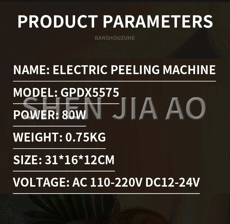 Name: Electric peeling machine Model: GPDX5575 Power: 80W Weight: 0.75kg Size: 31*16*12cm Voltage: AC 110-220V DC12-24V