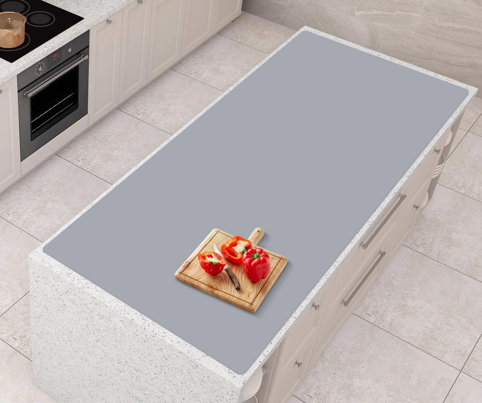 【ROLL UP AND SHIP 】: kitchen counter mat packaging is upgraded from folding to rolling, in order to provide customers with a better experience. You will no longer suffer from mat crease. The 47”x23.6”x0.08” counter mat is big enough for your large kitchen island and collect all the mess, thick enough to absorb impact from fragile dishes or cookware.