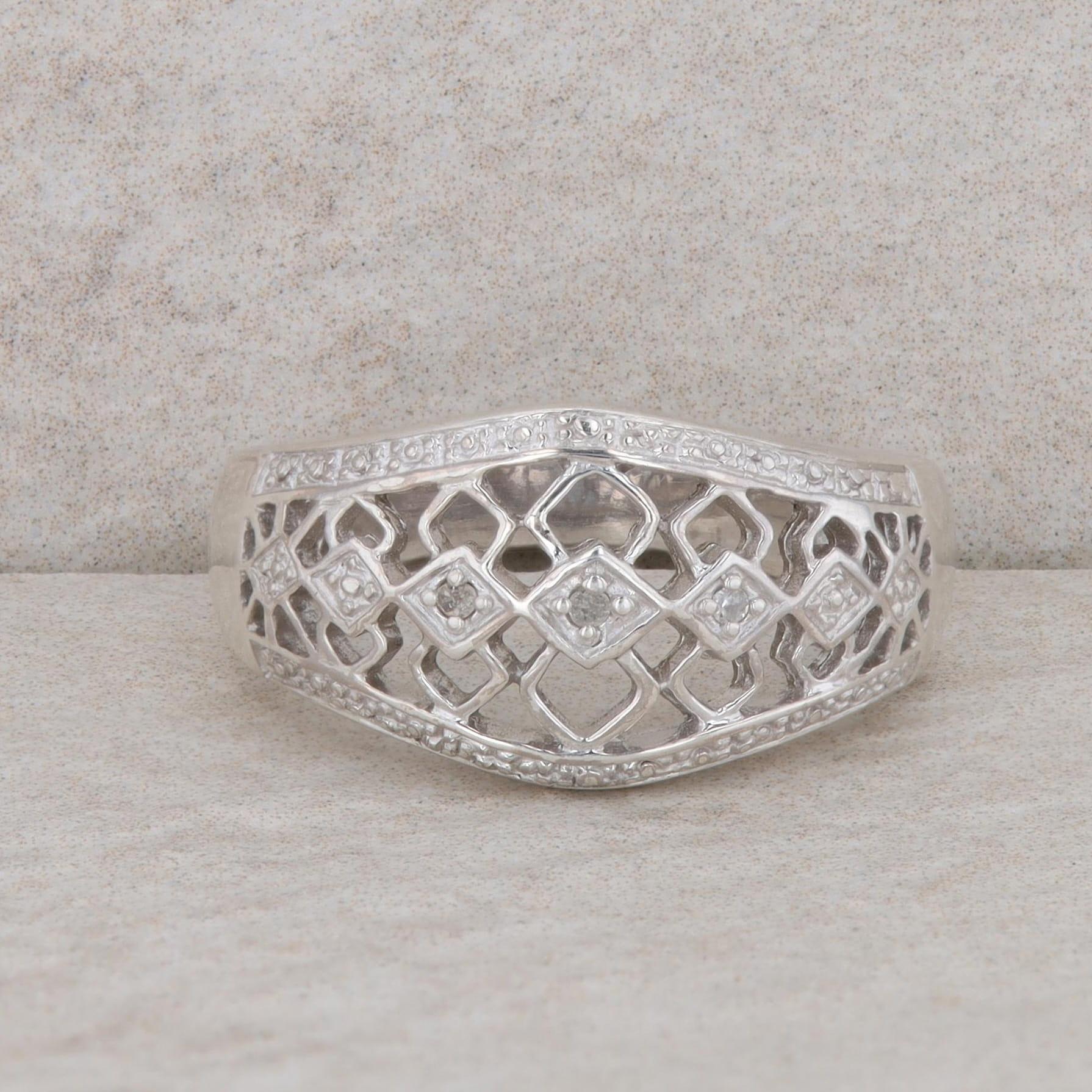This ladies sterling silver ring has three round single cut diamonds that measure approx 0.02ctw and they are set in a filigree domed style ring. These diamonds are I2 clarity and H-I in color. The ring measures 11.3 mm in height and the length of the design is 19.7 mm. The ring weighs 4.4 grams and the finger size is 7.