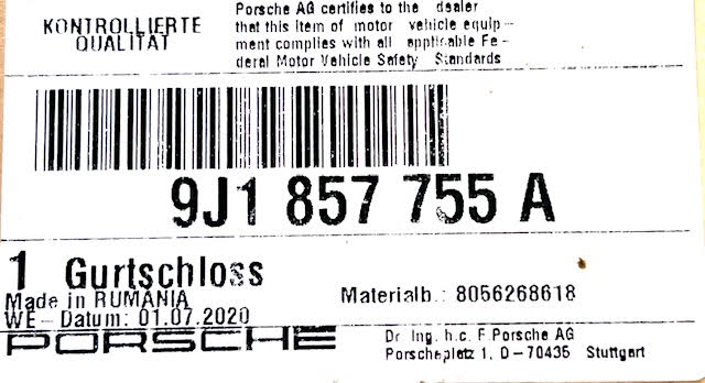 Porsche Taycan 2020-2021 Left Seat Belt Latch 9J1857755A