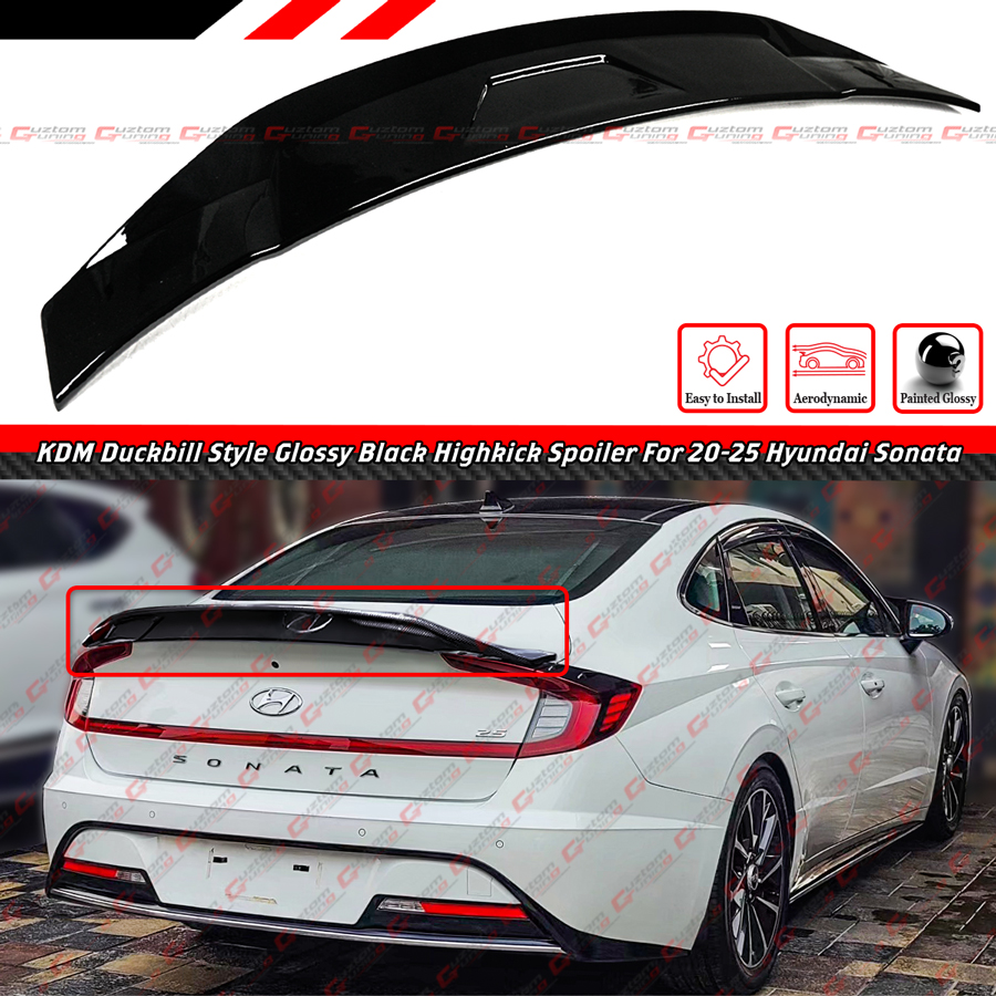 - KDM Duckbill Style Highkick Trunk Spoiler For Hyundai Sonata. This Was Designed to Stick Out On Both Ends and Leave Space In Between the Trunk and The Spoiler to Provide The Matching Rear Look With The Canards On The Taillight.