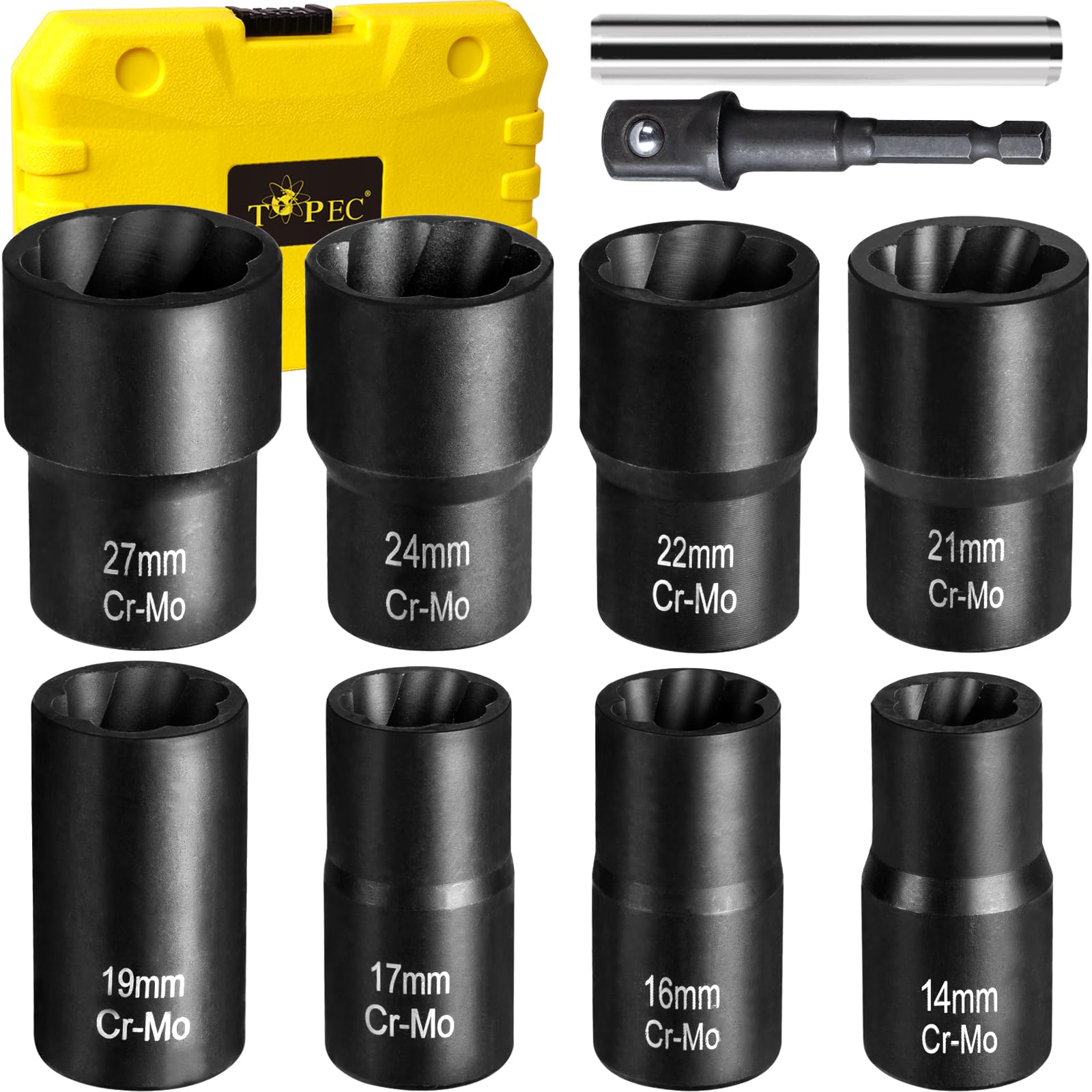VARIOUS SIZES AND USES:The lug nut extractor socket set is available in eight different sizes, including 14mm, 16mm, 17mm, 19mm, 21mm, 22mm, 24mm, 27mm and an extra metal rod.It can meet various needs of daily needs, whether it's car repair, home decoration, or process production, and can provide you with great convenience.