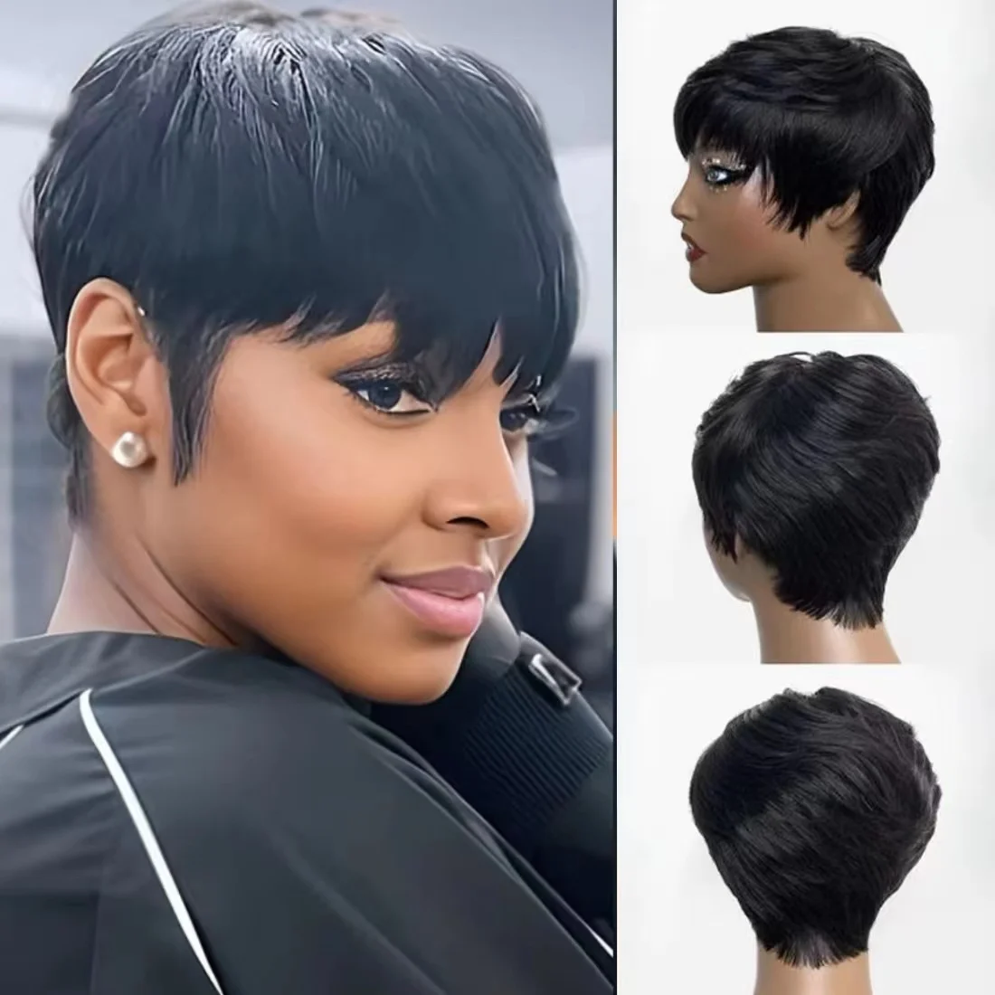 Pixie Short Cut Straight Human Hair Wigs With Bangs Full Machine Made