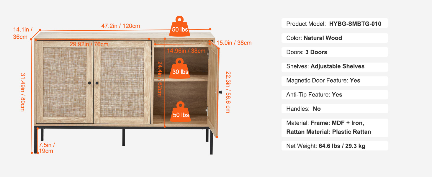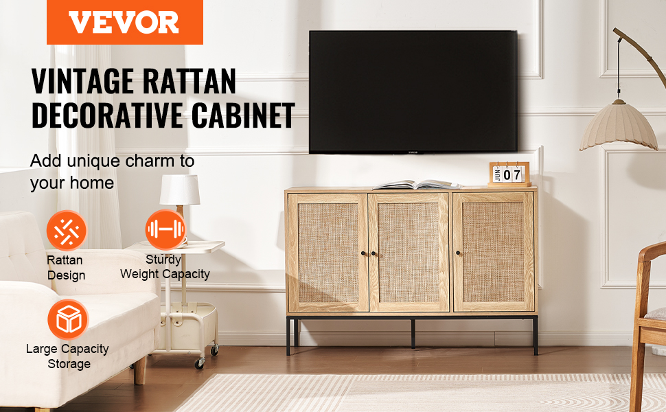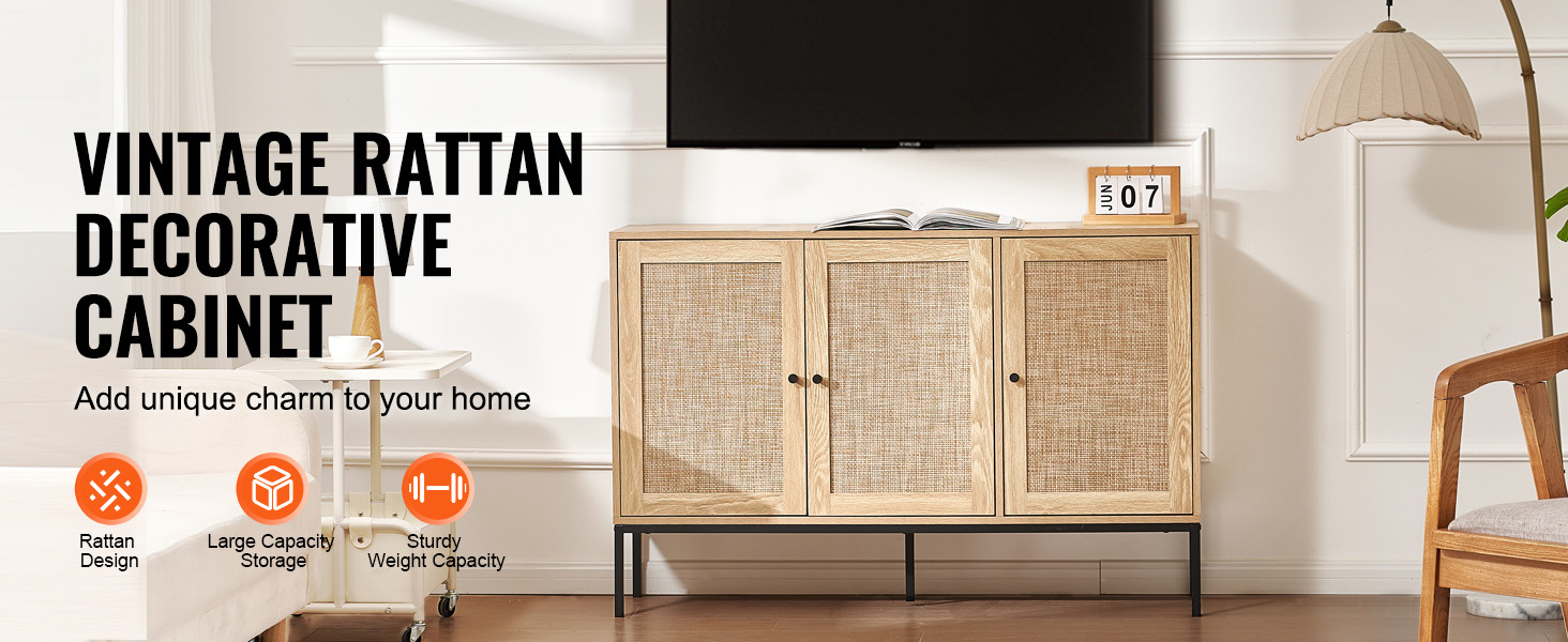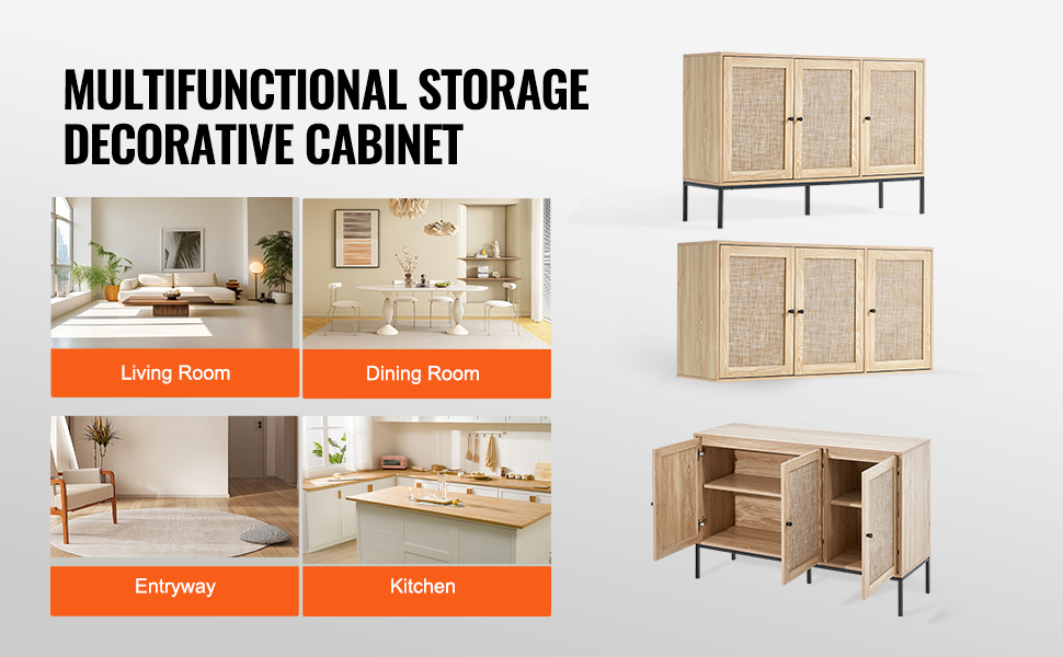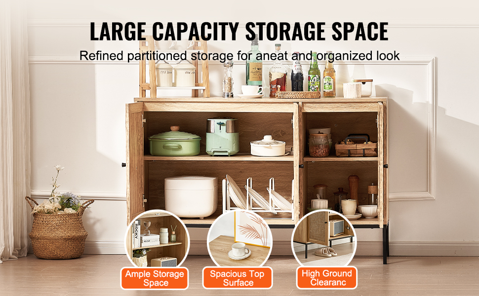 This rattan buffet cabinet offers the perfect storage solution, suitable for use as a kitchen sideboard, bar cabinet, storage unit, or entryway shoe cabinet. Its versatile design makes it adaptable to various settings, serving as both a storage unit and a decorative piece.