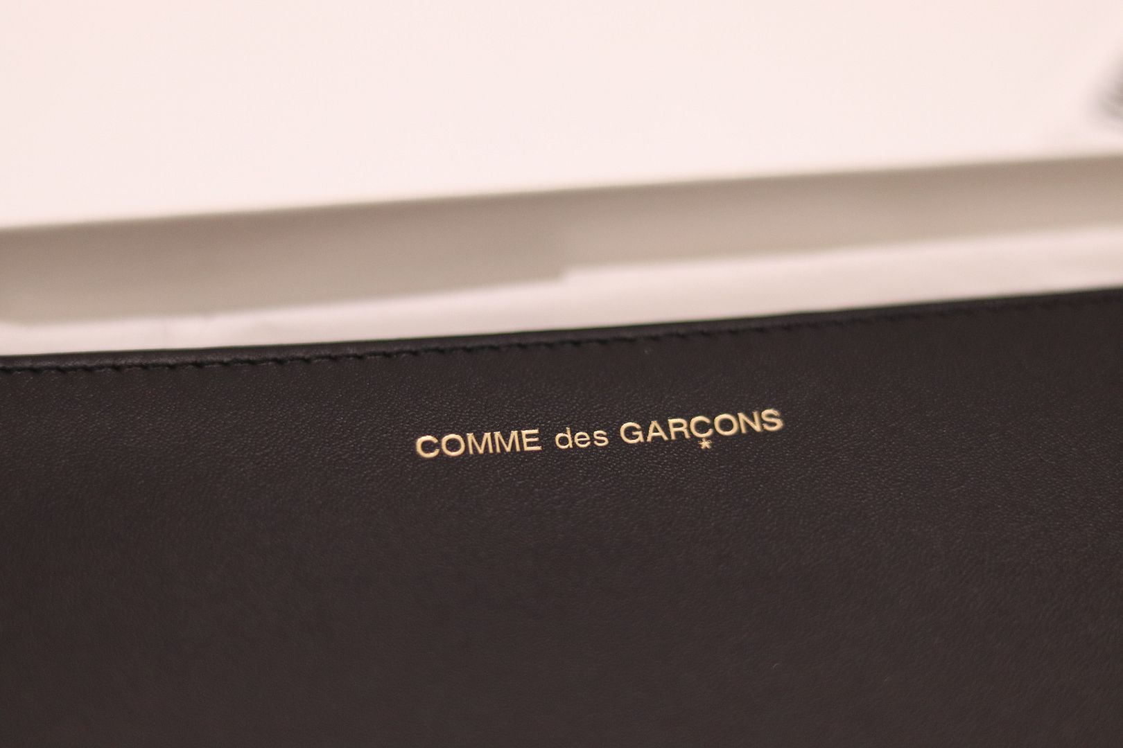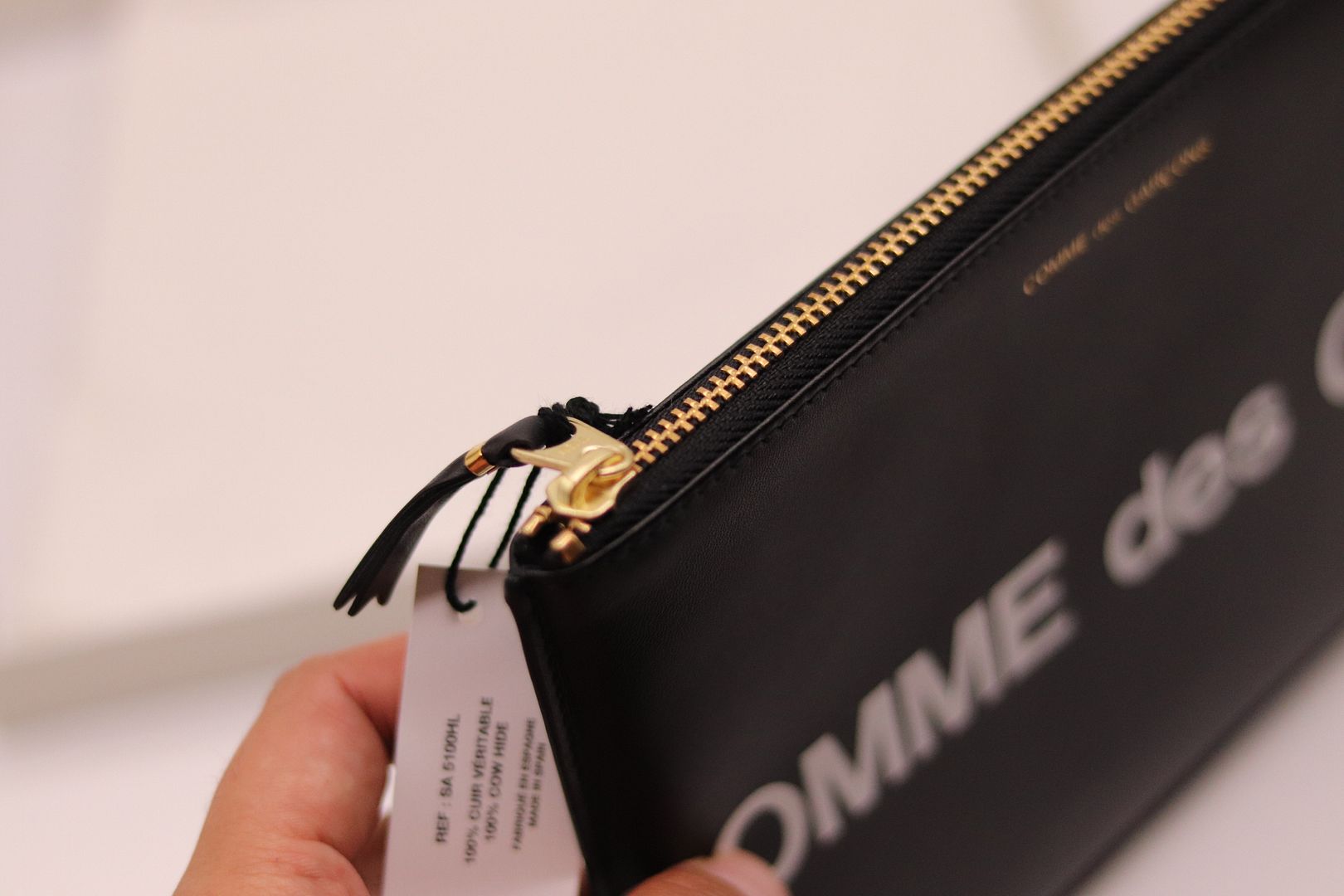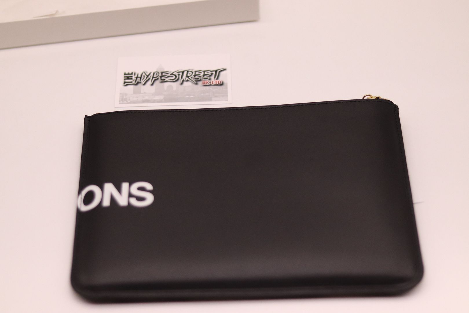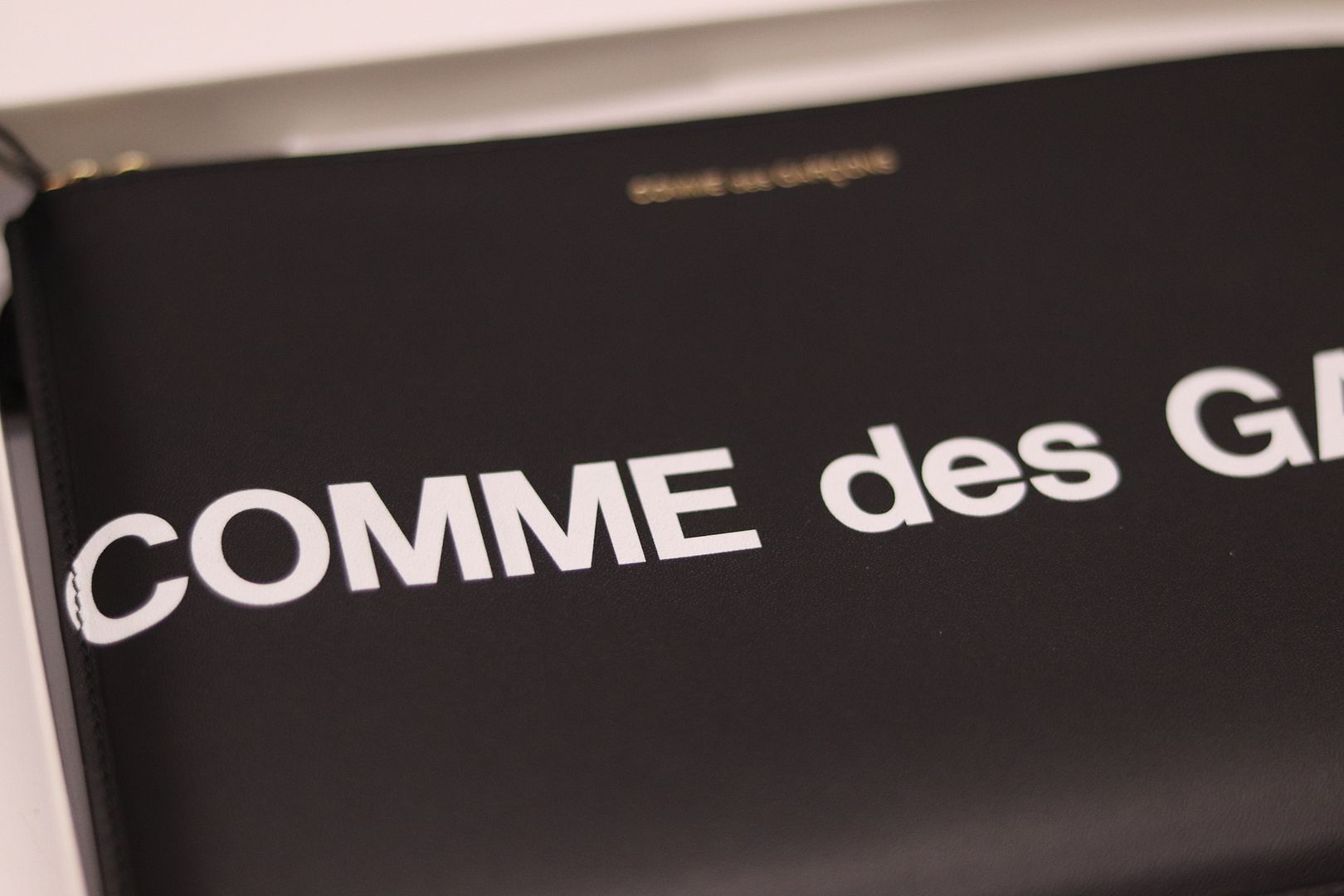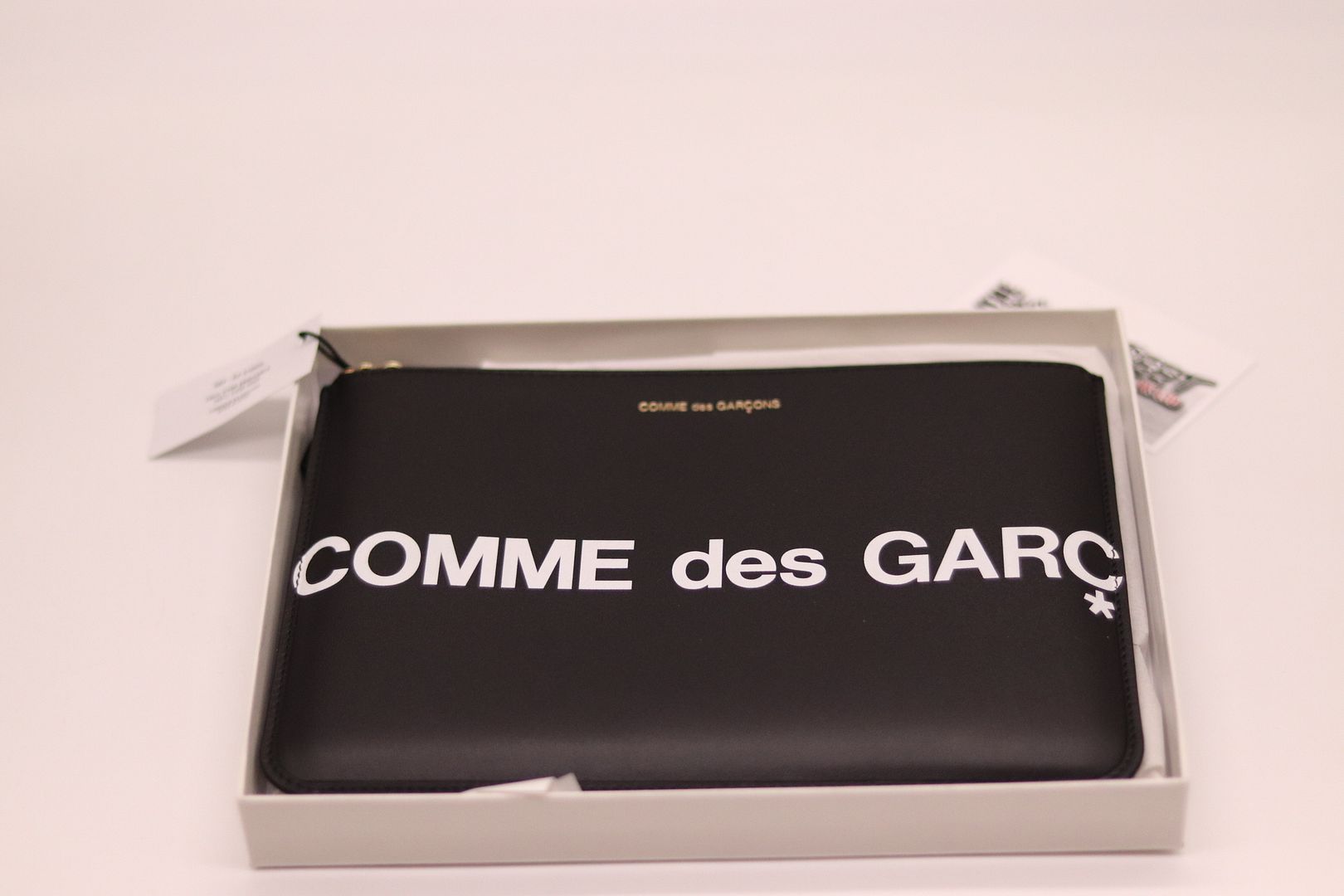 Brand New with Tags Take a chic approach to accessorizing with the Huge Logo pouch from Comme des Garçons Wallet. Made in Spain from black leather, this roomy piece secures with a zipped top fastening in gleaming golden hardware. The label's logo in bold white lettering runs across the design for cool recognition.