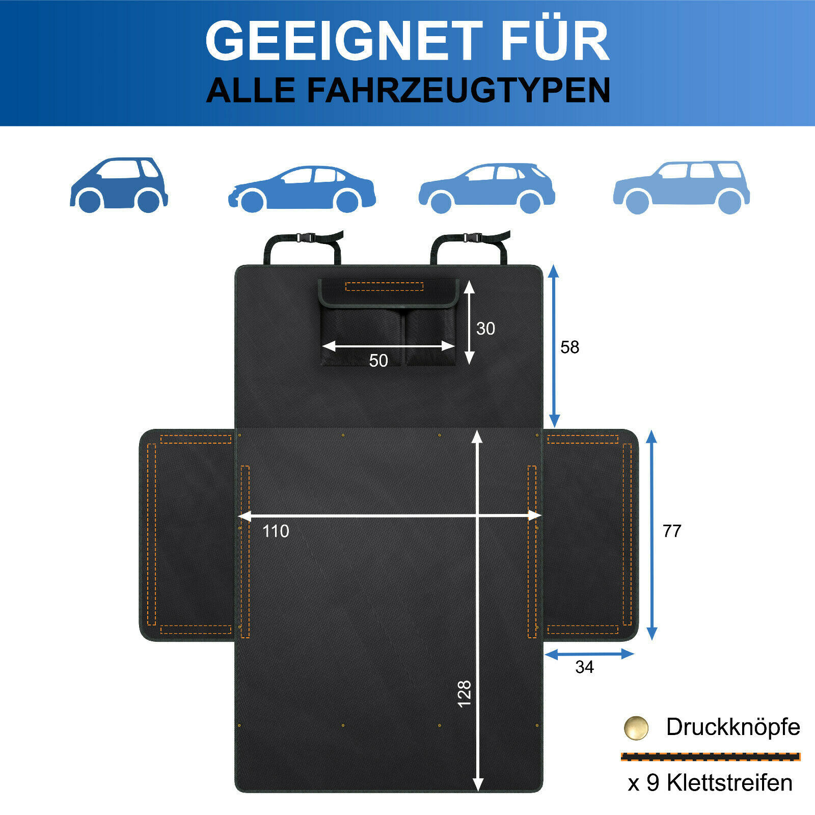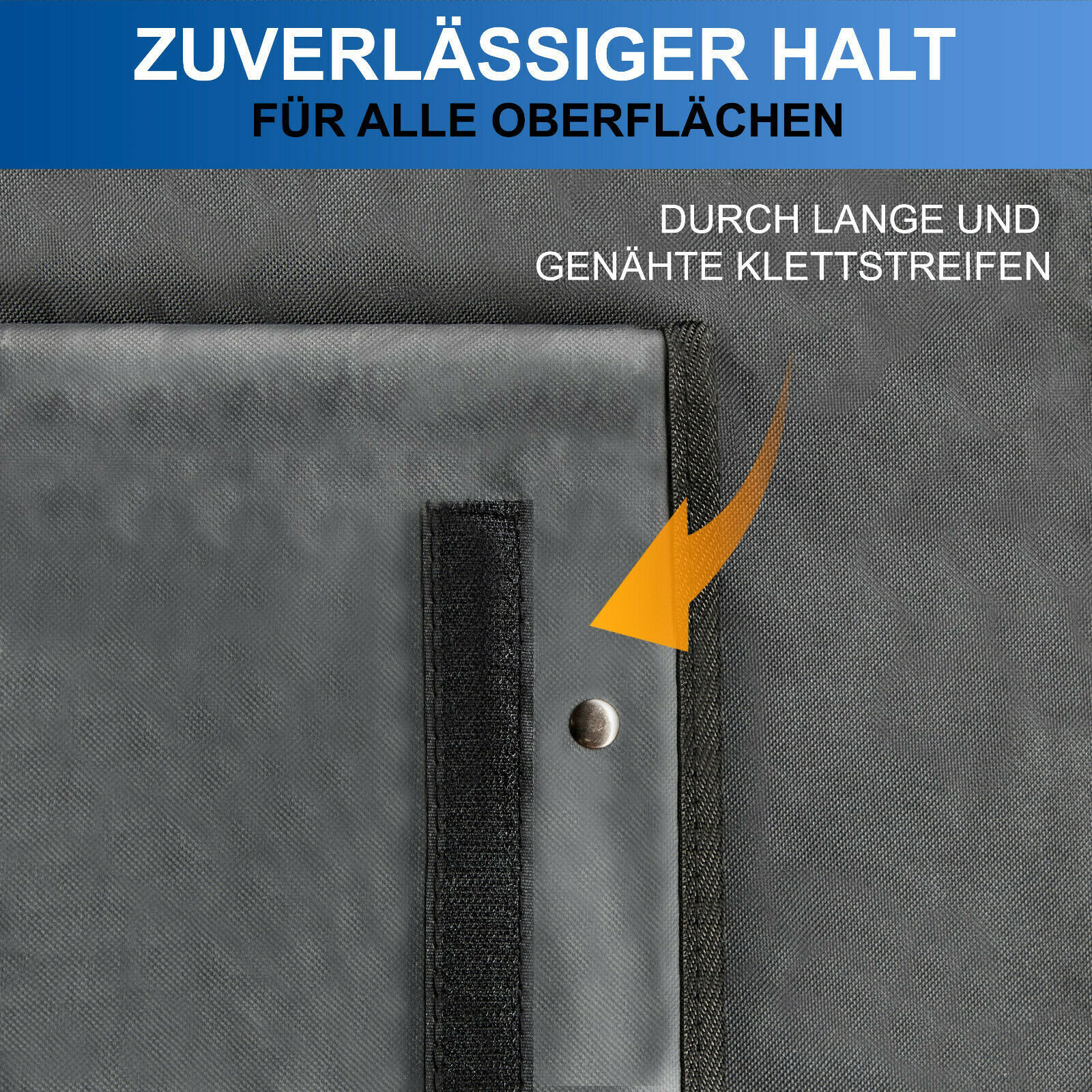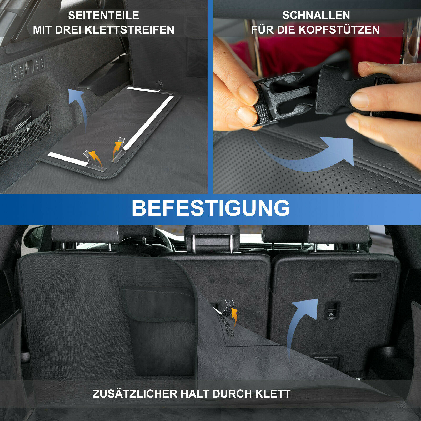Befestigen Sie die Kofferraumschutzmatte im Handumdrehen mit den Klickverschlüssen an den Kopfstützen. Die Klettverschlüsse an der Unterseite und den Seitenteilen sorgen zusätzlich für stabilen Halt.
