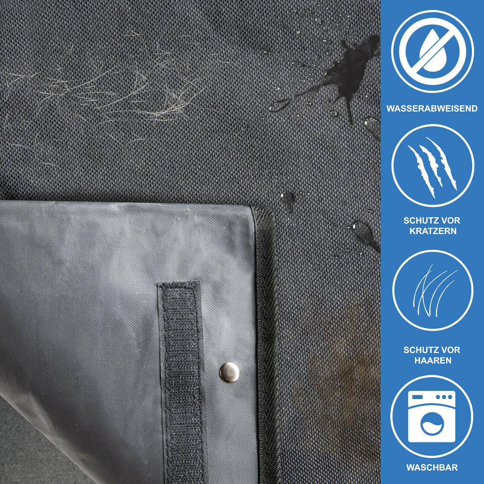 Dank der integrierten Verlängerung der WhizProducts Autoschondecke bleiben Ladekante und Stoßstange beim Einsteigen des Hundes vor Kratzern geschützt. Das Material der Hundedecke für den Kofferraum ist wasserdicht, kratzfest und robust.