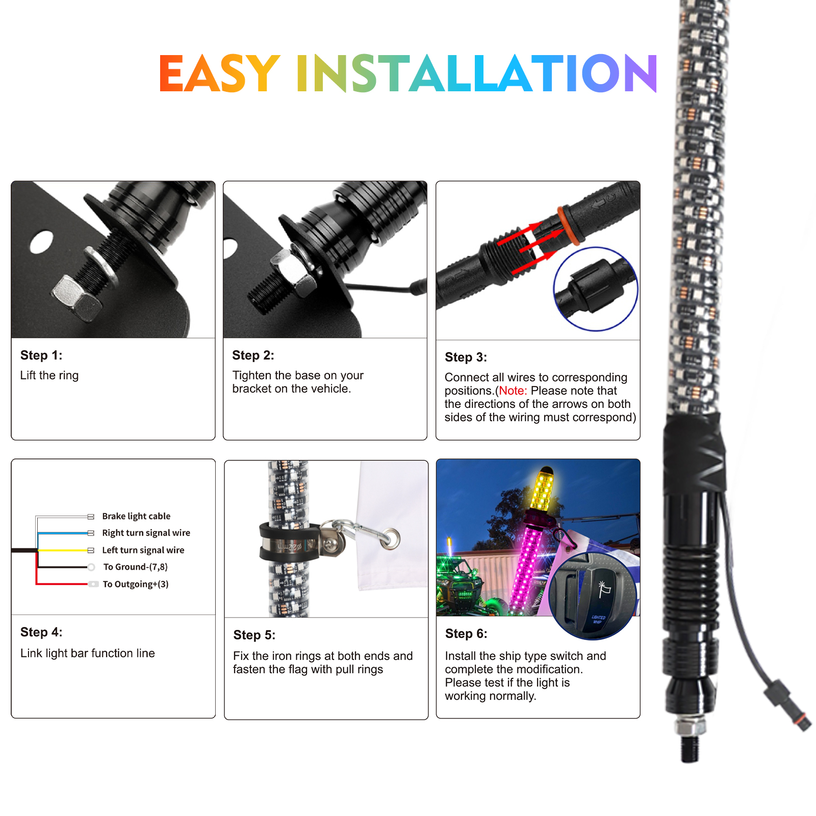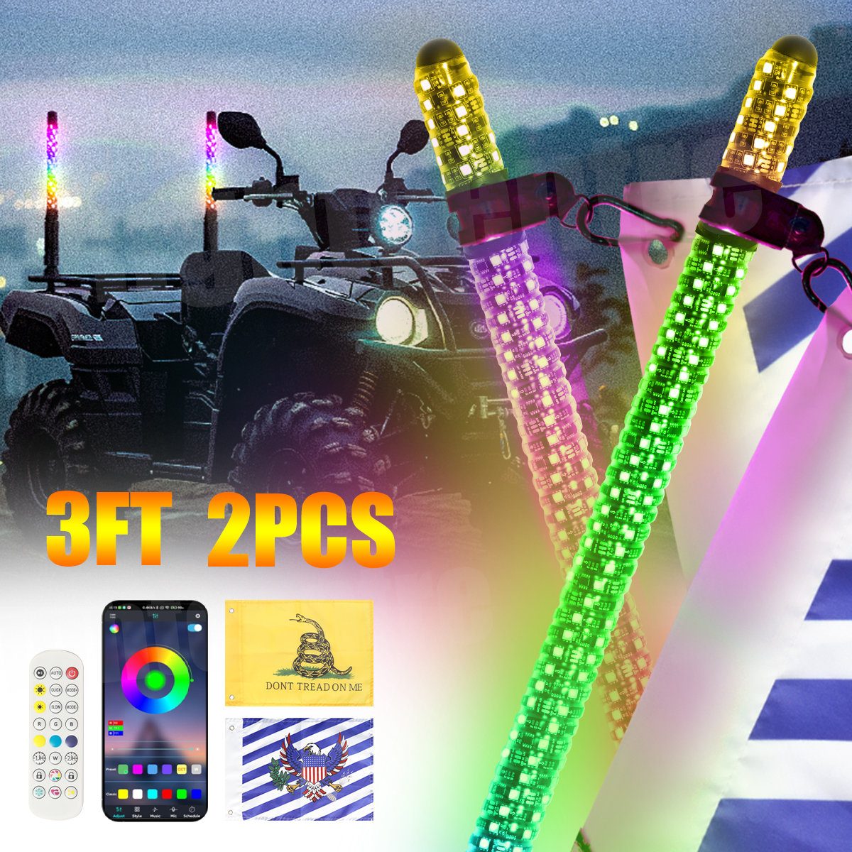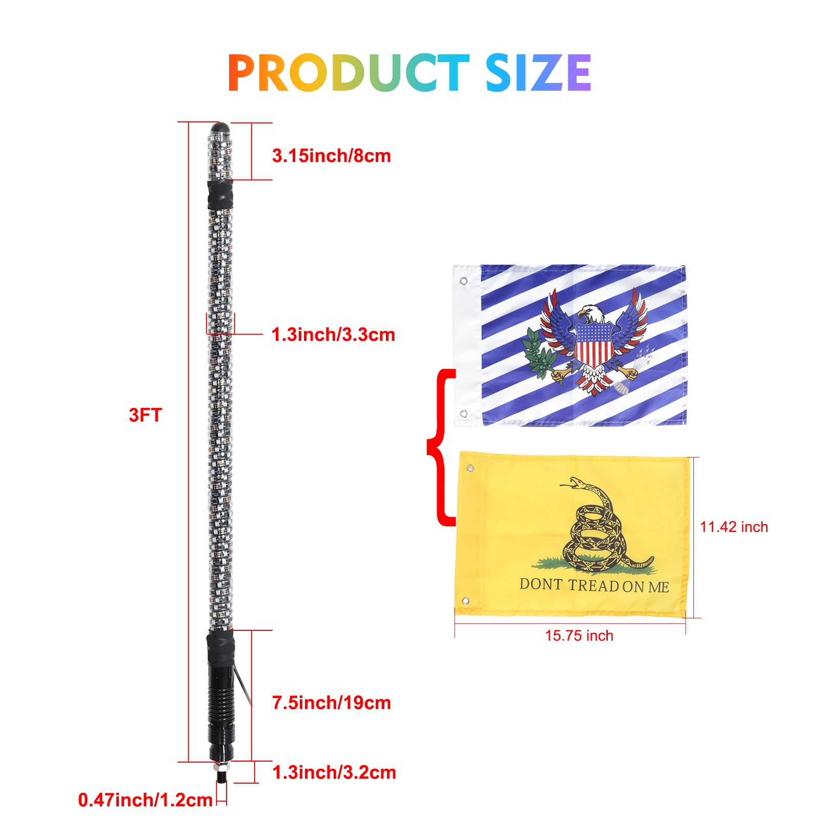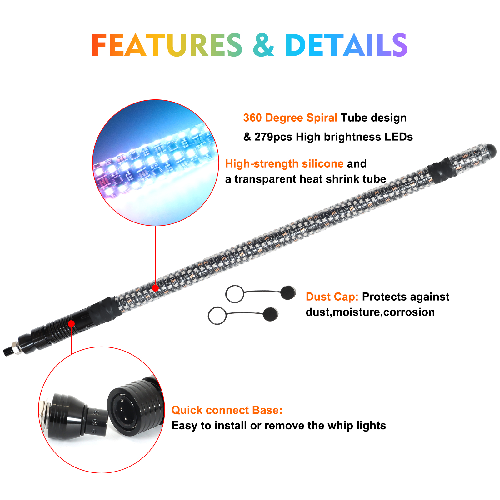 360° SPIRALING LED WHIP LIGHT Our LED whip light uses ultra-bright 5050 SMD to get super bright colors. The Bluetooth controller can change the color of the led whip light to produce a variety of discoloration and chasing effects to illuminate the entire night. 20 color combinations, 5 brightness levels, and 10 flash patterns settings make your car look different and easily appeal to others. Note: The remote distance must within 10 meters.Specification: