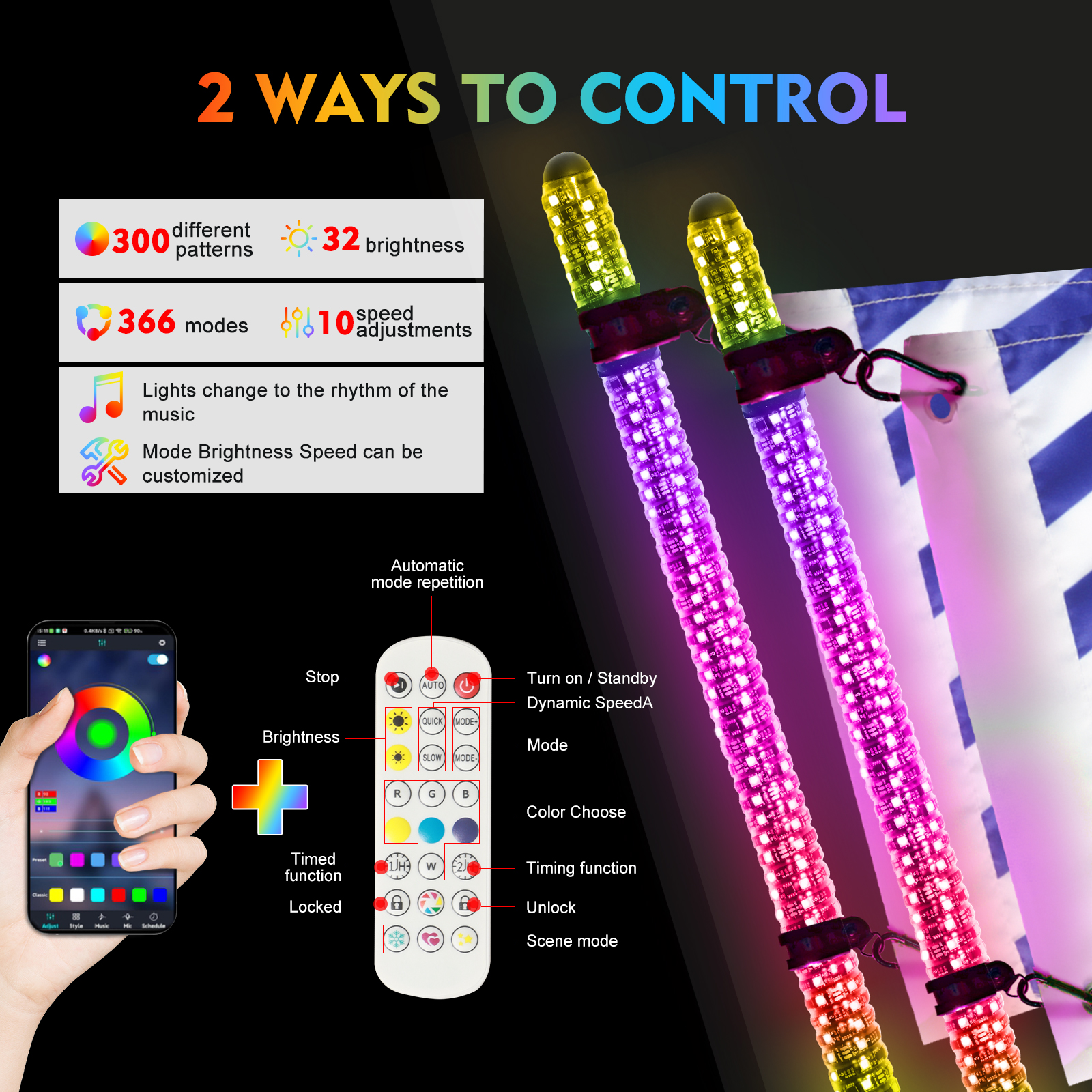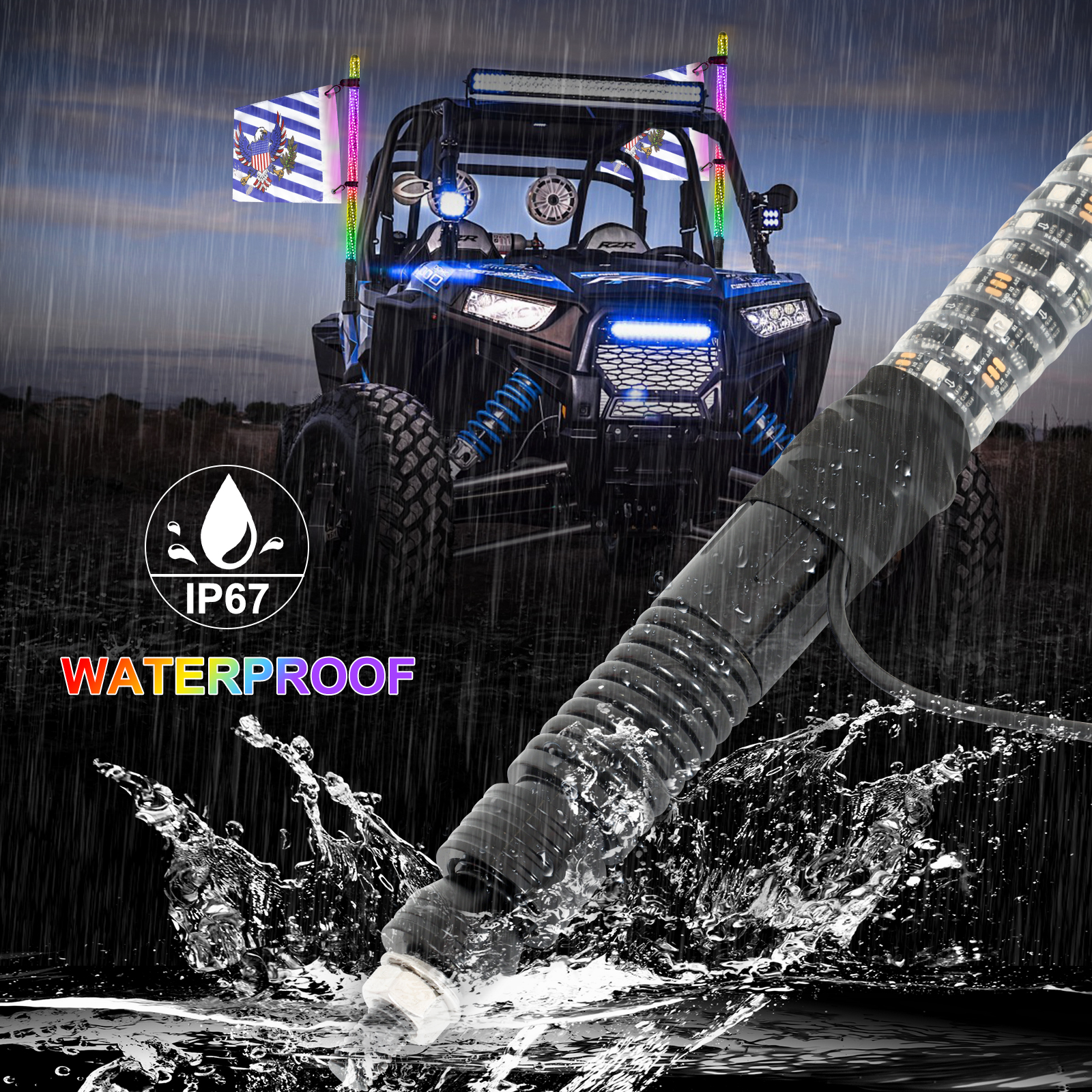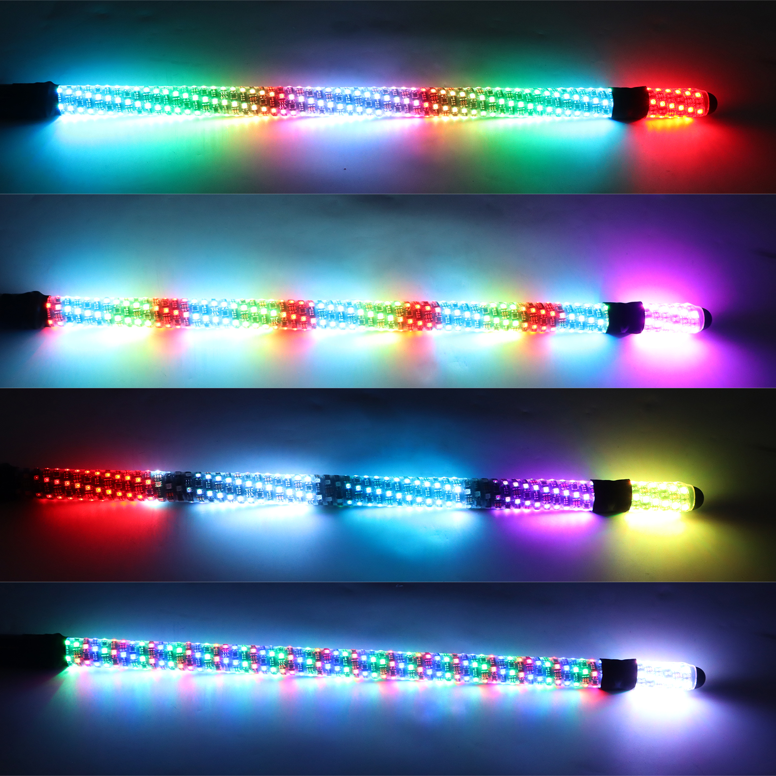 360° SPIRALING LED WHIP LIGHT Our LED whip light uses ultra-bright 5050 SMD to get super bright colors. The Bluetooth controller can change the color of the led whip light to produce a variety of discoloration and chasing effects to illuminate the entire night. 20 color combinations, 5 brightness levels, and 10 flash patterns settings make your car look different and easily appeal to others. Note: The remote distance must within 10 meters.Specification: