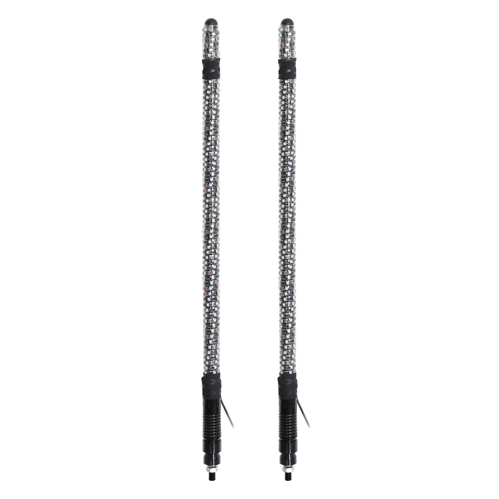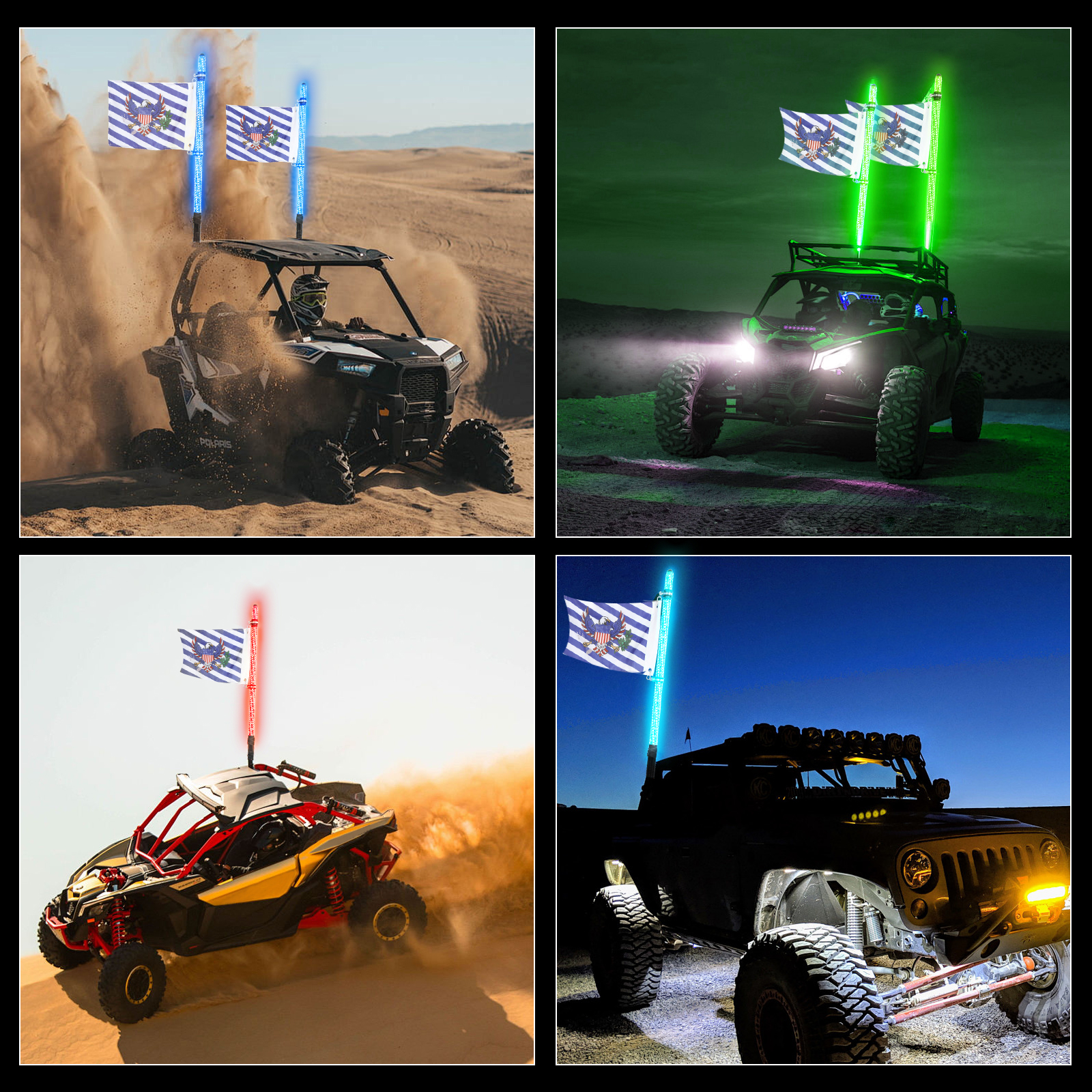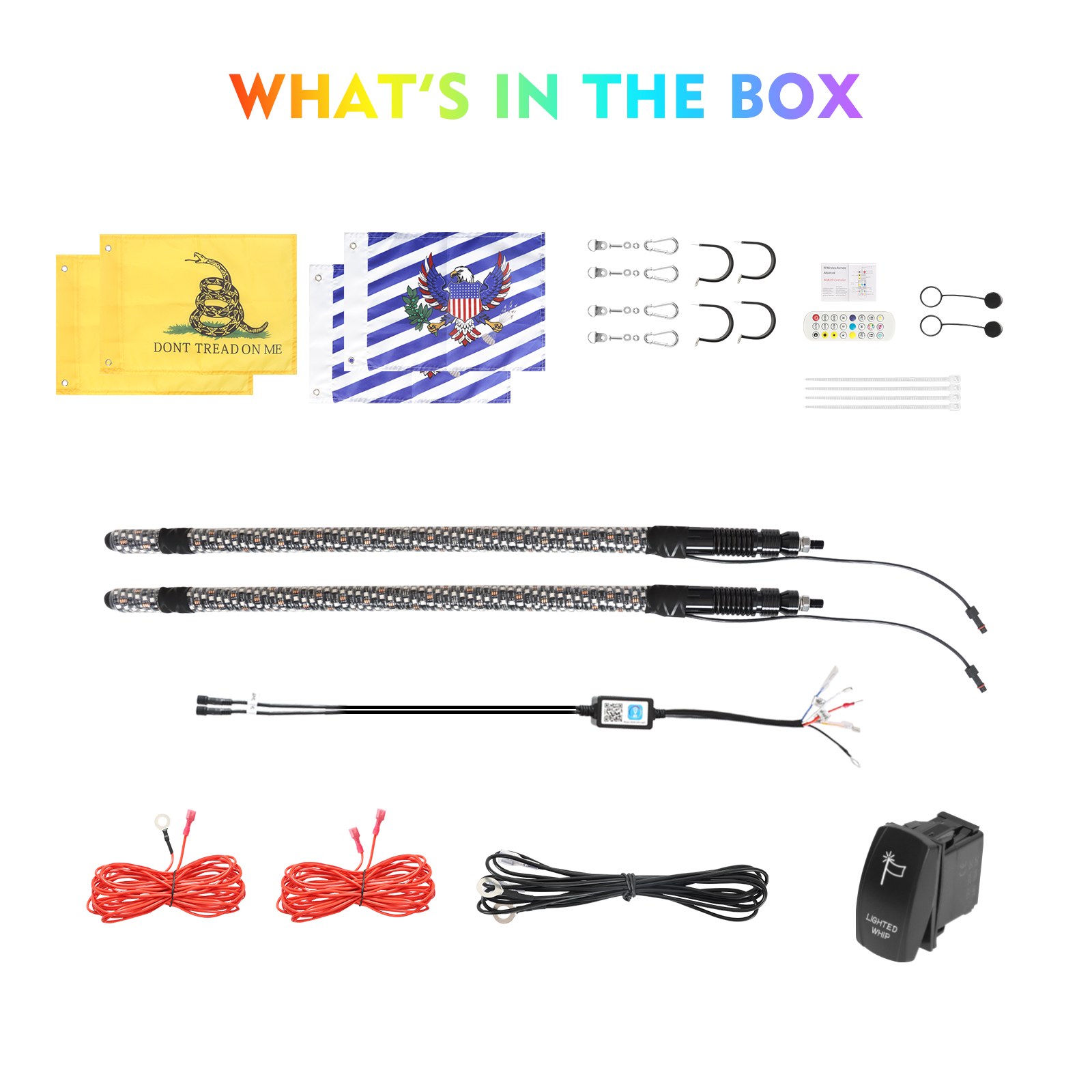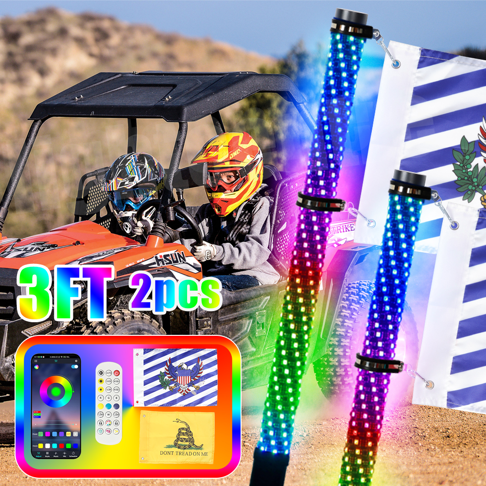 360° SPIRALING LED WHIP LIGHT Our LED whip light uses ultra-bright 5050 SMD to get super bright colors. The Bluetooth controller can change the color of the led whip light to produce a variety of discoloration and chasing effects to illuminate the entire night. 20 color combinations, 5 brightness levels, and 10 flash patterns settings make your car look different and easily appeal to others. Note: The remote distance must within 10 meters.Specification: