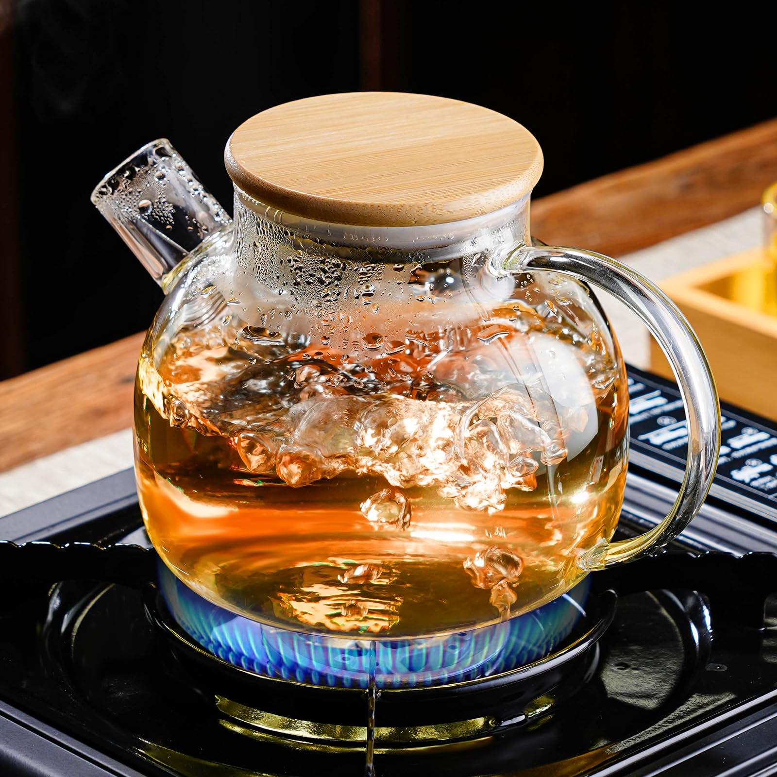 【Tight Sealing Bamboo Lid】The glass teapot for stovetop comes with a tight silicone reinforced bamboo lid, ensuring it is 100% airtight and leak-proof. So you can enjoy your tea easily without the boiling hot liquid leaking or spilling when you turn the glass tea kettle.