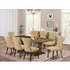 EAST WEST FURNITURE - LAGA9-78-03 - 9-PC DINING TABLE SET The Kitchen Set includes a set of 8 elegant dining room chairs and a modern dining table with fantastic pedestal legs. The Dining Table Set features a distressed Jacobean wooden dining table and stunning antique walnut padded parson chairs, adding beauty to your dining area. The pedestal dining table is crafted from high-quality rubber wood, and the modern dining chairs are made from durable wood capable of supporting weights up to 300 lbs. This Wooden Dining Room Set is finished with a premium quality distressed Jacobean and antique walnut color. The kitchen parson chairs are essential pieces of furniture in your home, serving not only as a place to enjoy meals but also as a space for food preparation, socializing with loved ones, and even hosting casual home parties. This set brings a rustic and stylish look to your living area, comfortably seating 8people around the wooden dining table. Cleaning this Kitchen Set is effortless with any furniture clearance product. The simple design of this Wood Dining Set allows for easy assembly, making it convenient to move from one location to another. Experience the joy of East West furniture as you continue to enjoy your dining experiences. PRODUCT FEATURES: Parson Dining Chairs Frame Material: Rubber Wood Mid Century Dining Table Frame Material: Asian Wood Table Top and Legs Color: Distressed Jacobean finish Chairs Legs Color: Antique Walnut finish Chair Seat Material: Linen Fabric Seat Chair Seat Color: Brown Table Top Style: Rectangular Top Chair Back Style: Stylish Back Sizes of Small Dining Table: Length: 92/68; Width: 42; Height: 30. Dimensions of Parson Chair: Length: 23; Width: 18; Height: 36. Included in the package: 8 Parson Dining Room Chairs and a Pedestal Dining Table.