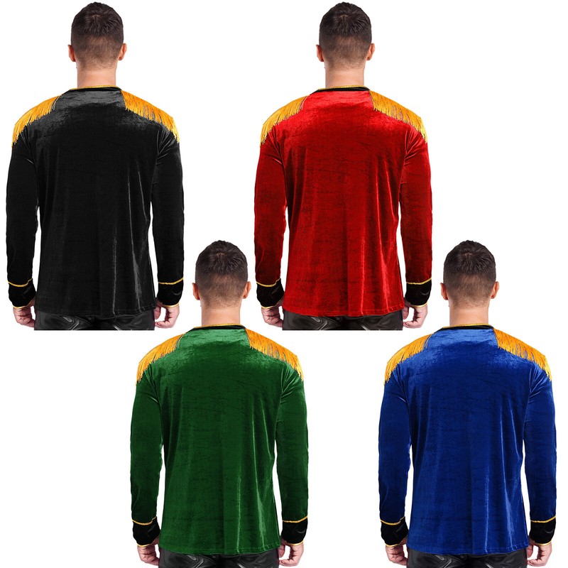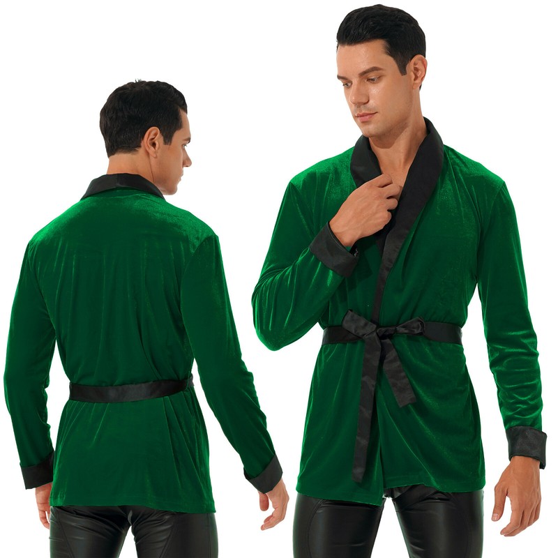 Men Christmas Role Play Costume Color Block Velvet Bathrobe Long Sleeve Night-robe Tops with Belt.