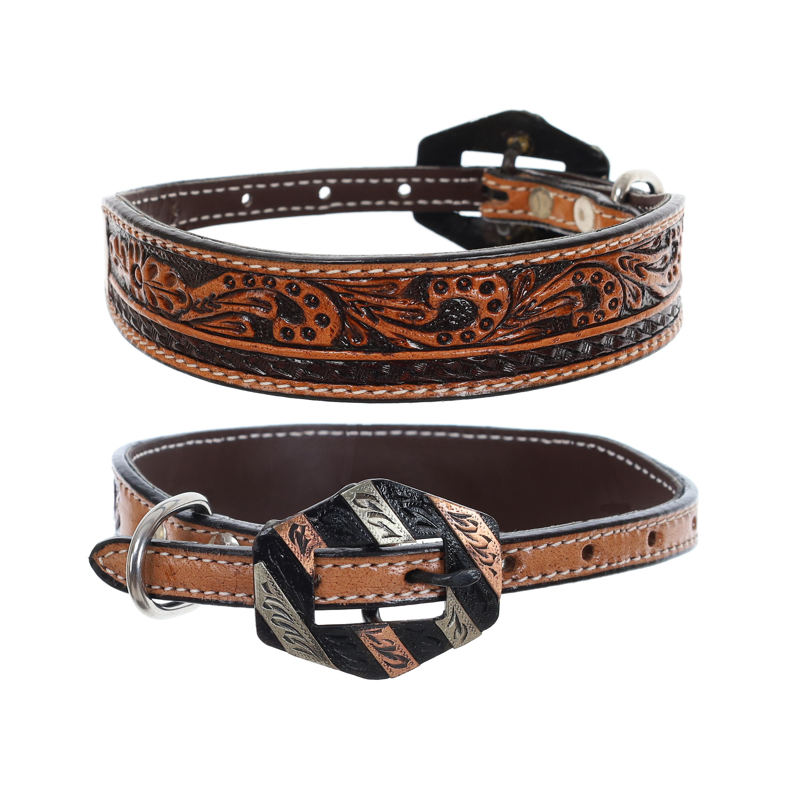 Dress up your pup in classic Western style with the Showman Paisley Leather Dog Collar! This beautiful collar combines medium-oiled leather with dark oiled accents, creating a rich, warm look that stands out in any setting. The detailed leaf tooling adds a touch of elegance and artistry, making this collar perfect for dogs who deserve a little extra flair. It's more than just a collar—it’s a statement piece that adds Western charm to every walk or adventure.