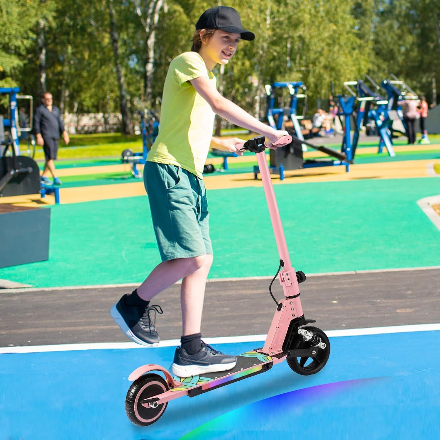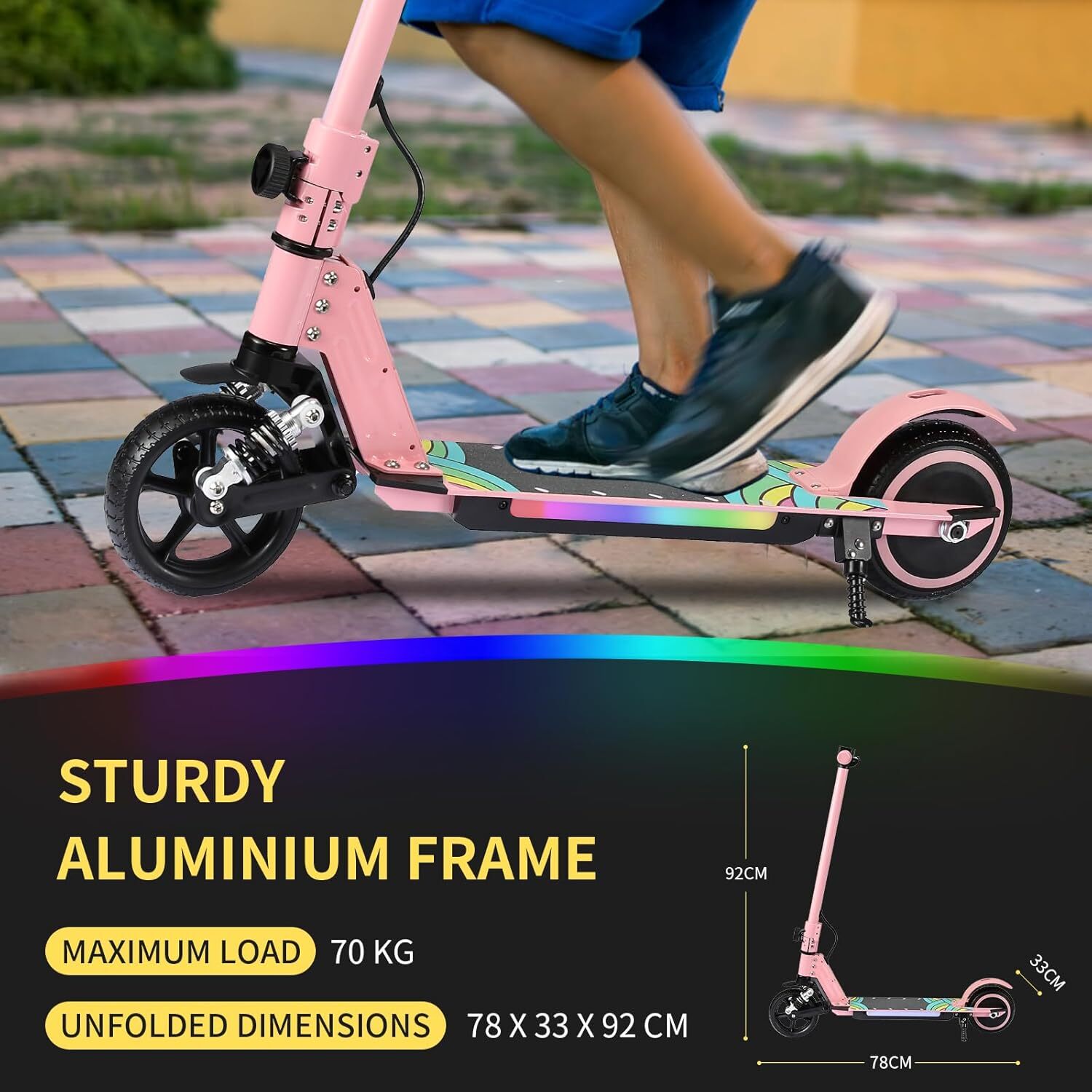 Buntes Lichtdesign:Neben den Pedalen des Kinderrollers blinken Regenbogen-LED-Lichter. Die farbenfrohen Lichter ziehen die Aufmerksamkeit der Zuschauer auf sich und machen Ihr Kind zum Mittelpunkt der Aufmerksamkeit. Außerdem können sie Fahrzeuge und Fußgänger daran erinnern, nachts Abstand zu halten, was die Fahrt sicherer macht.