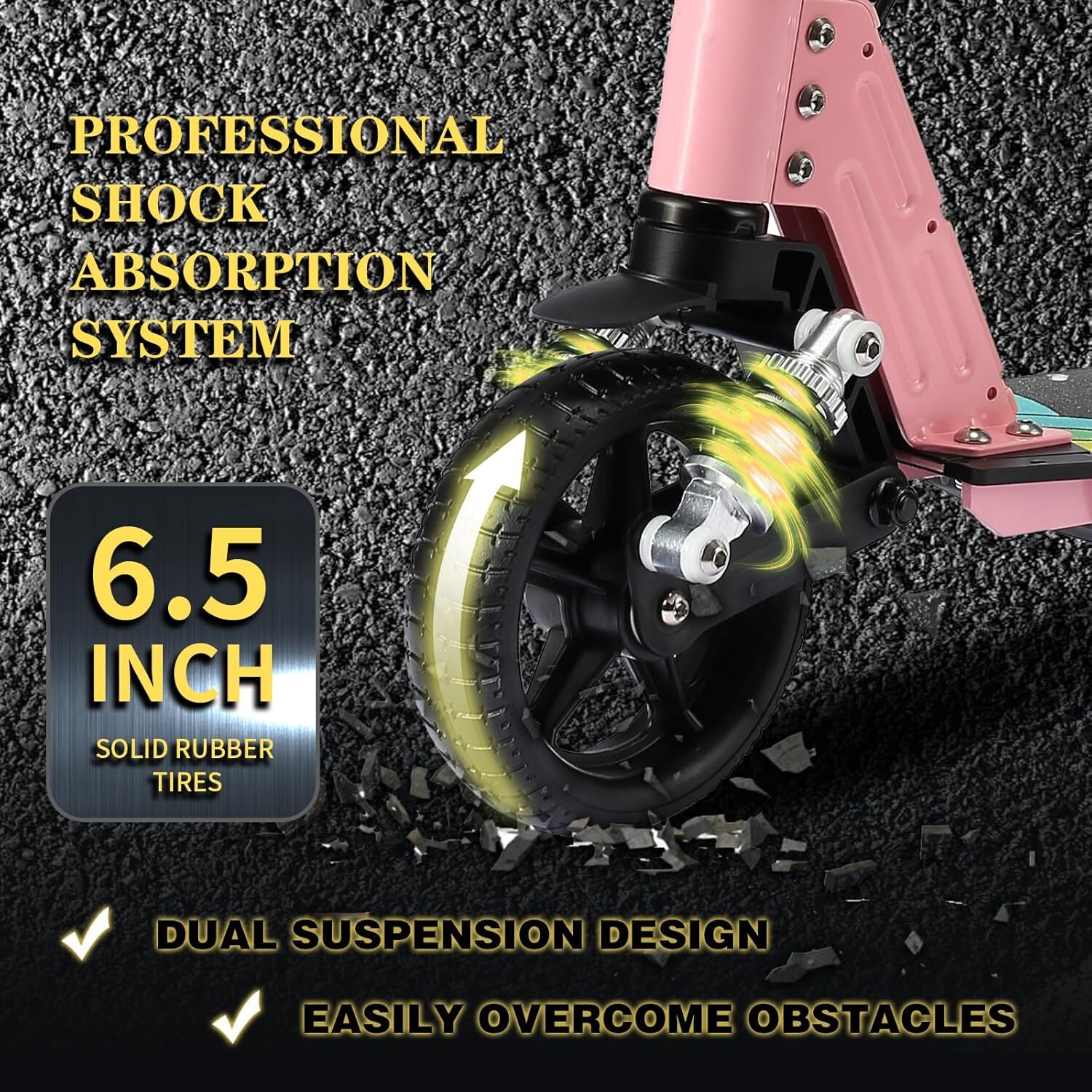 Guter Komfort: Die Kombination aus Federung an der Vorderachse und den hochelastischen 6,5-Zoll-Vollgummireifen kann der Roller holprige Straßen und unebene Oberflächen mit Leichtigkeit bewältigen und bietet eine glatte und komfortable Fahrt.