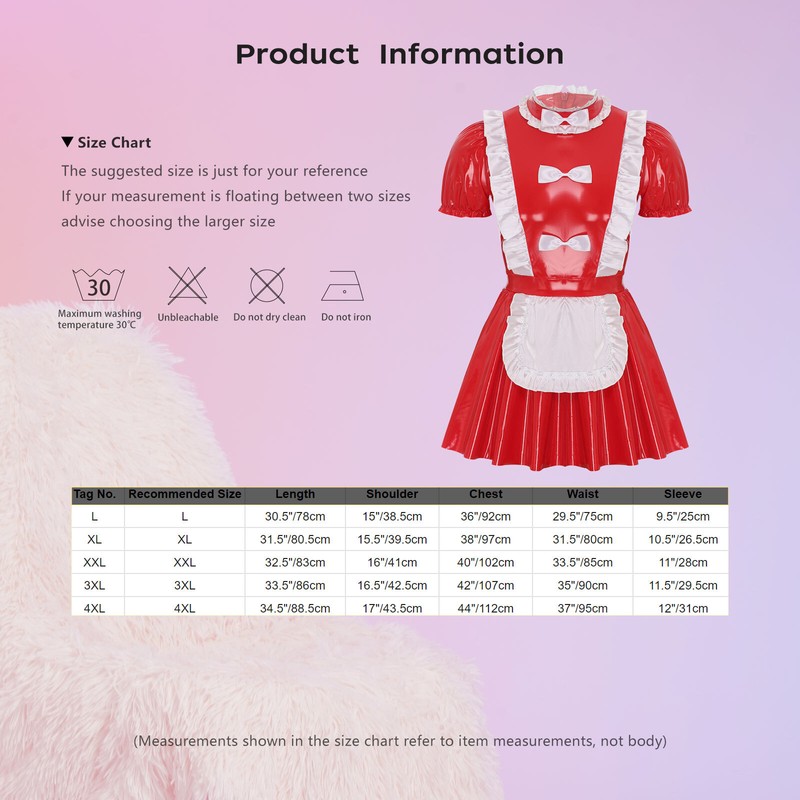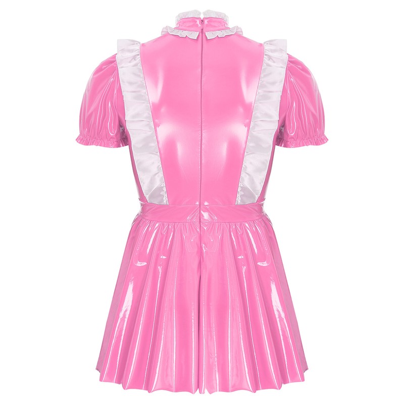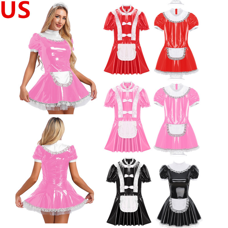 Women’s maid dress-up dress adopts satin and patent leather patchwork, integrated apron, short puff sleeve and back zipper closure.