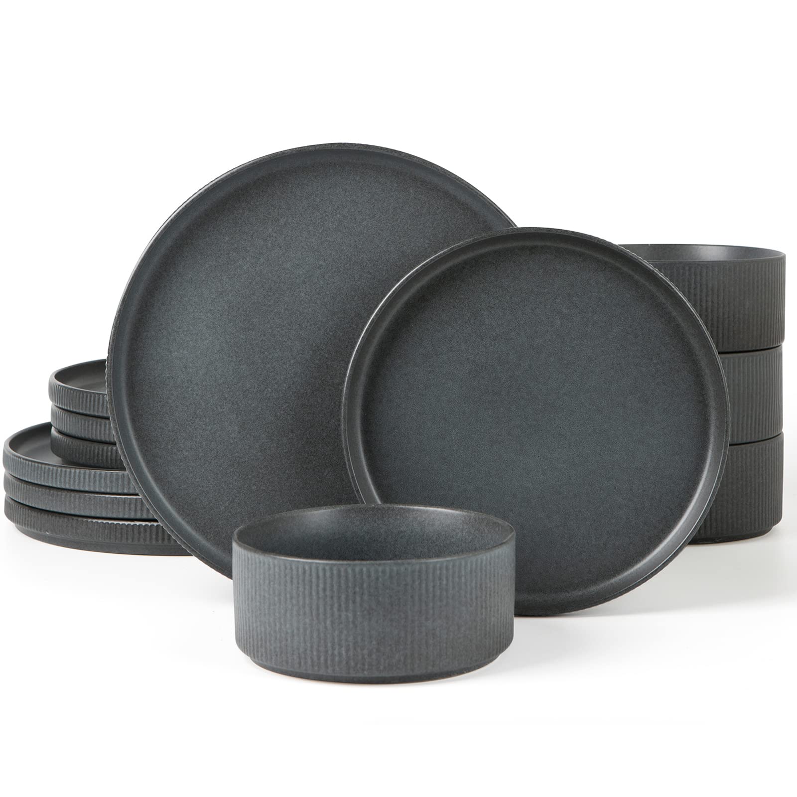 Star Dinnerware Sets, Plates and Bowls Set for 4, 12 Piece Dish Set, Ribbed, Full Glaze Matte Dark Charcoal