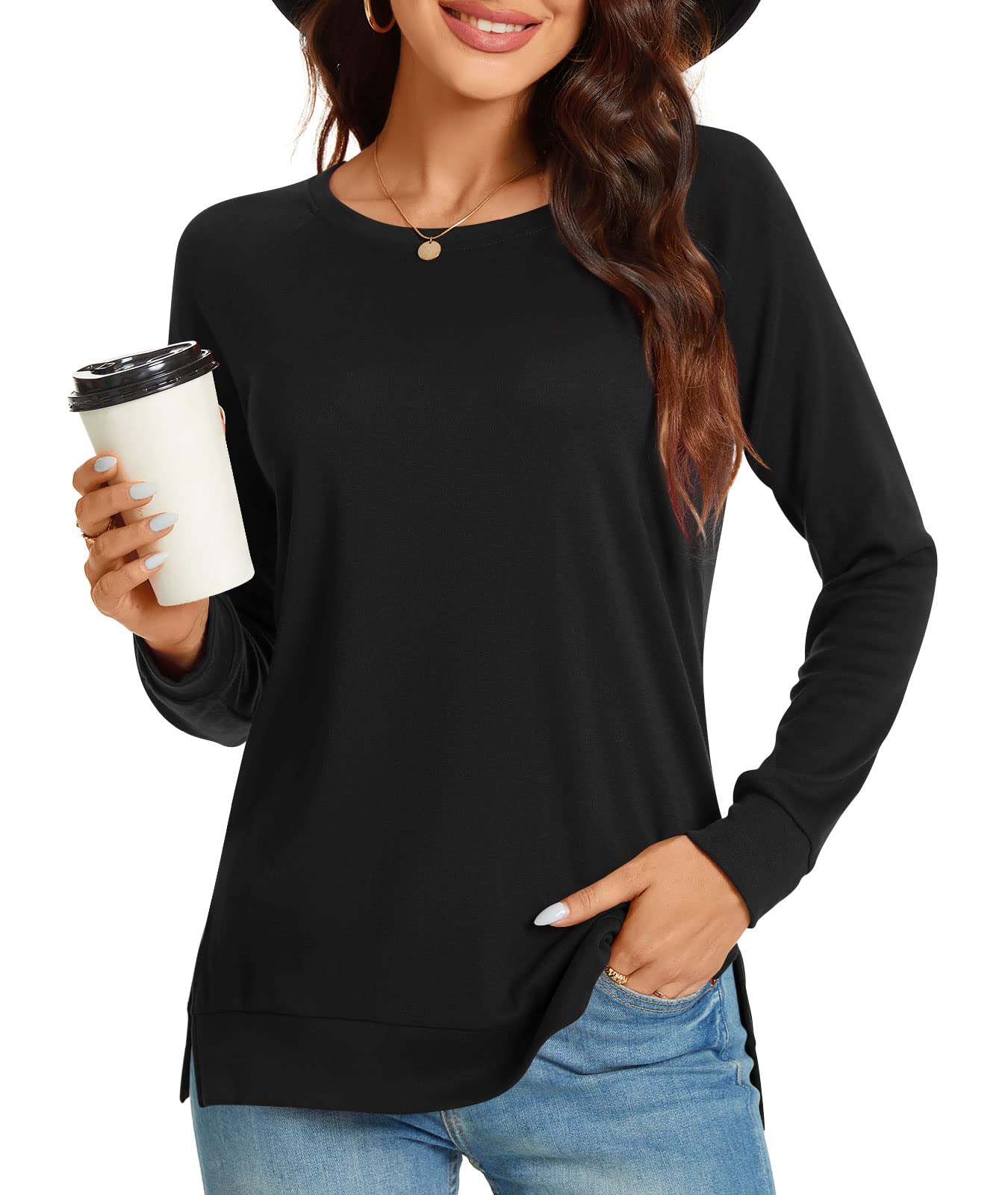 Women's 2024 Fall Casual Long Sleeve T-Shirt Side Split Tunic Tops for Leggings Loose Crewneck Sweater Small, Black