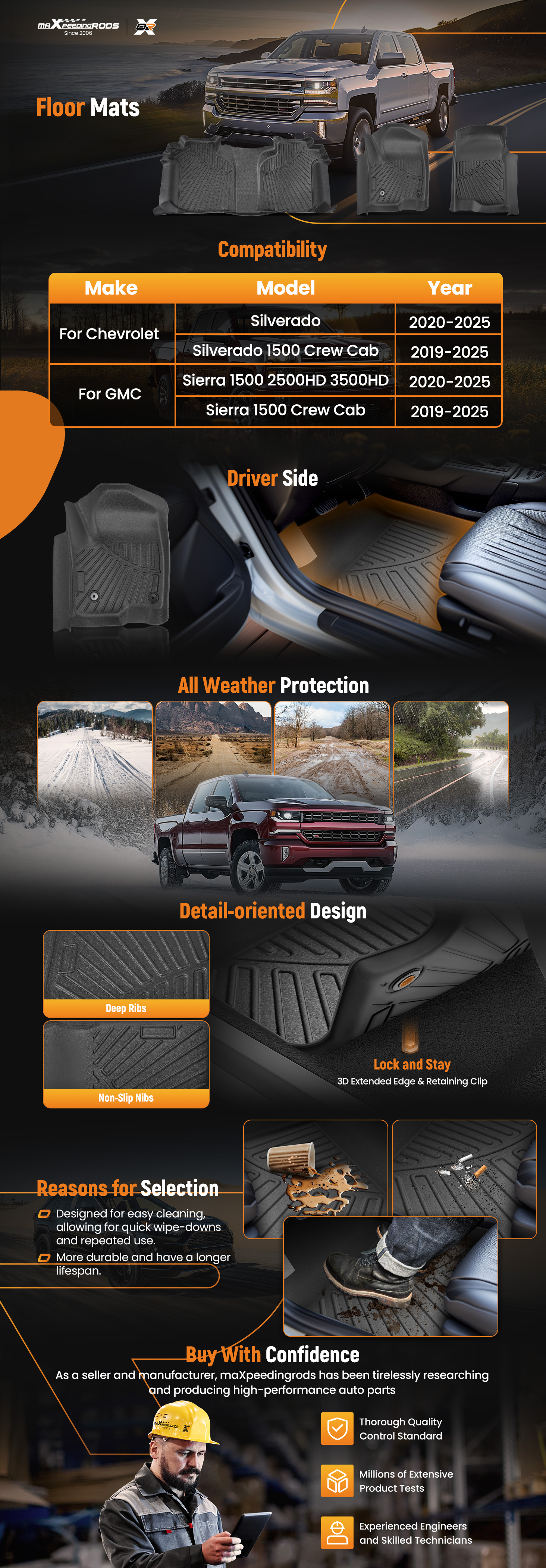 - All-weather protection, Unique designed channels and raised edges can effectively trap the liquid, snow, sand, etc.
