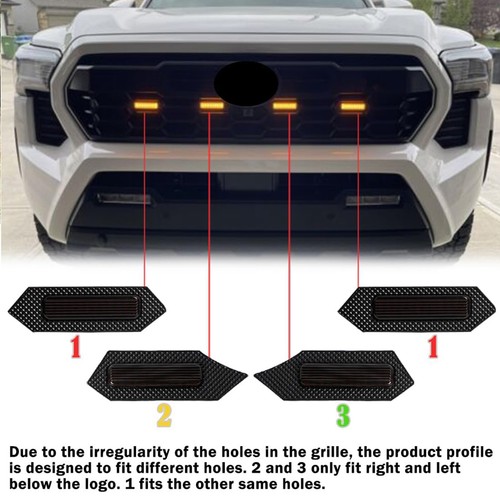 Unique Designed: These clear shell amber grille lights are perfectly fit for Tacoma TRD Sport/Off-Road/Pre Runner 2024-2025 grille. High-brightness amber light will give your vehicle a cool overall look and make your car unique. Easy To Recognize: Upgraded waterproof LED front grille lights with bright lights for improved vehicle recognition. Make your vehicle more visible to other drivers in bad weather. Safer Driving. Durable Quality: The LED grille light is made of ABS plastic, which is scratch-resistant, waterproof and corrosion-resistant. Each set is equipped with a wiring harness and a fuse adapter, which can provide a longer service life. Fast Installation: Simply insert the light into the corresponding hole in the grille and connect the wiring harness. Please follow the steps for installation. Package Include: 4 Pcs led grille lights, 1 Set 4 in 1 wiring harness, 1 fuse.