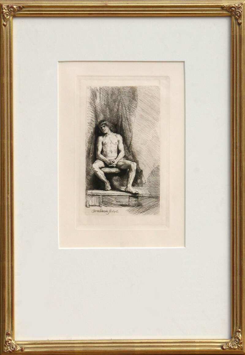 Rembrandt van Rijn, After by Amand Durand, Dutch (1606 - 1669) - Seated Nude. Medium: Etching, Image Size: 6.5 x 3.75 inches, Size: 9.5 x 6.5 in. (24.13 x 16.51 cm), Frame Size: 17.75 x 12 inches, Printer: Amand Durand, Description: French Engraver and painter Charles Amand Durand, (1831-1905) is recognized and praised for accomplishing the difficult task of renewing original copper plate designs made by Rembrandt; It is by Amand that many of Rembrandt's works were saved. He also restored plates by Albrecht Durer, Beham, and other various Old Masters from the 15th, 16th, and 17th centuries. The task started when the main curator of the Louvre gave Amand Durand the important mission of restoring the worn down and fragile engravings made by Rembrandt. This is a modern printing from the Durand plates.