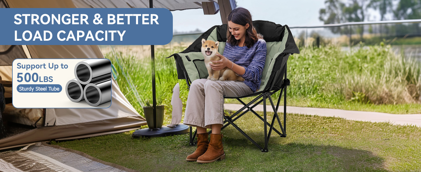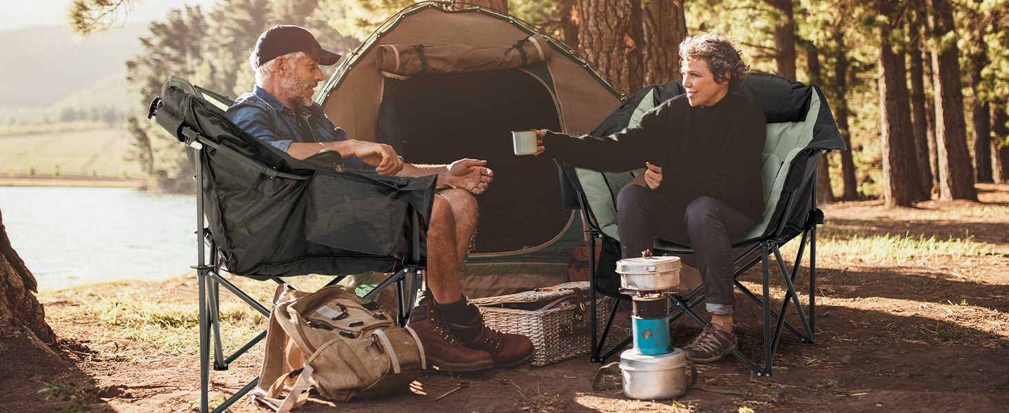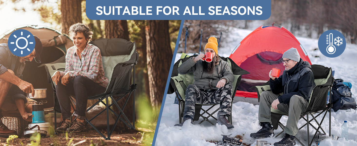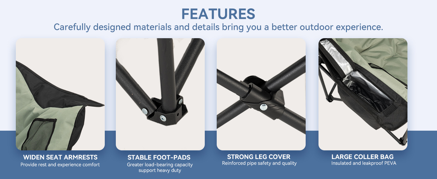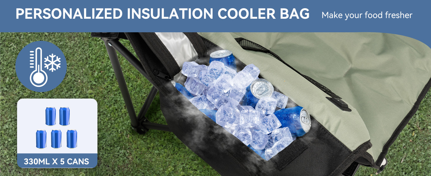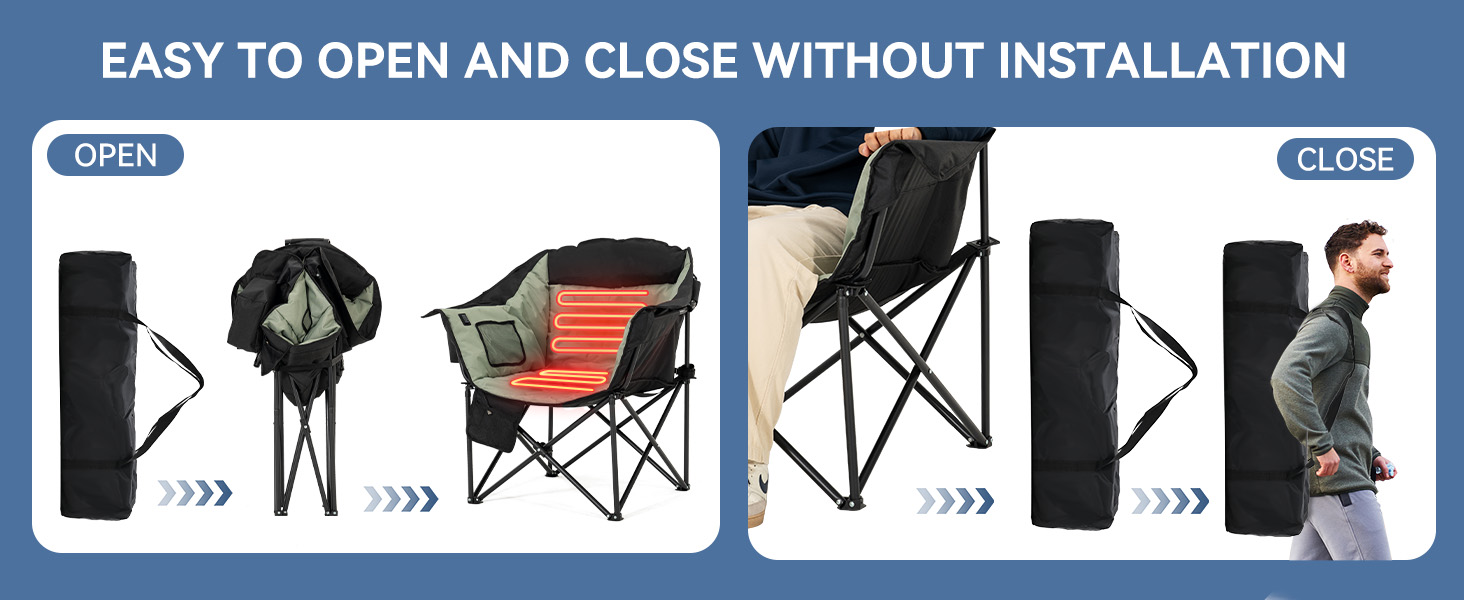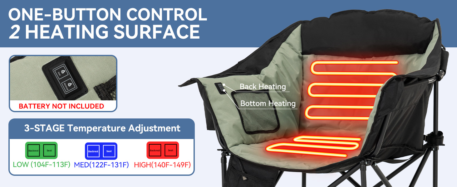 - HEATED CAMPING CHAIRS:Our heated chairs are perfect for camping! These are camping essentials, regardless of the season. The heating function lets you sit comfortably even in cold weather. With a three-speed heating function, the 104℉-149℉ heating range adapts to various temperatures when you venture out (excluding mobile power) - SPACIOUS AND COMFORTABLE SPACE:The seating area, measuring 22x24 feet, offers ample space for enjoyment. The maximum load capacity of 500LB brings you a reassuring sense of security, while the specially thickened padding gives you the sensation of sitting on a cloud - LARGE CAPACITY THERMAL COOLING BAG:The 1.5-liter thermal cooling bag can accommodate around 5 drinks of 330ml each. Featuring a waterproof and cold-resistant PEVA liner, it's ideal for holding your favorite beverages - MADE FOR THE OUTDOORS:Whether you're fishing, camping, or watching a game, make sure to pack our outdoor camping chairs! We've meticulously designed the structure of our camping chair, incorporating armrests, pillows, and two mesh bags that provide additional space for your belongings - THICKENED STRUCTURAL DESIGN:Compared to regular 16mm pole lawn chairs, ours have been thickened to 19mm, offering superior stability, durability, and longevity
