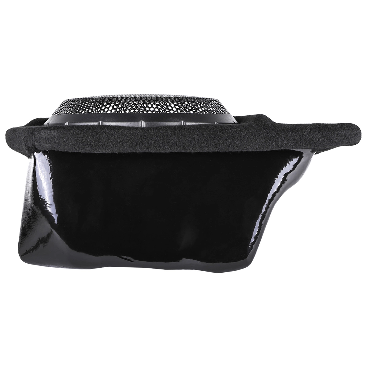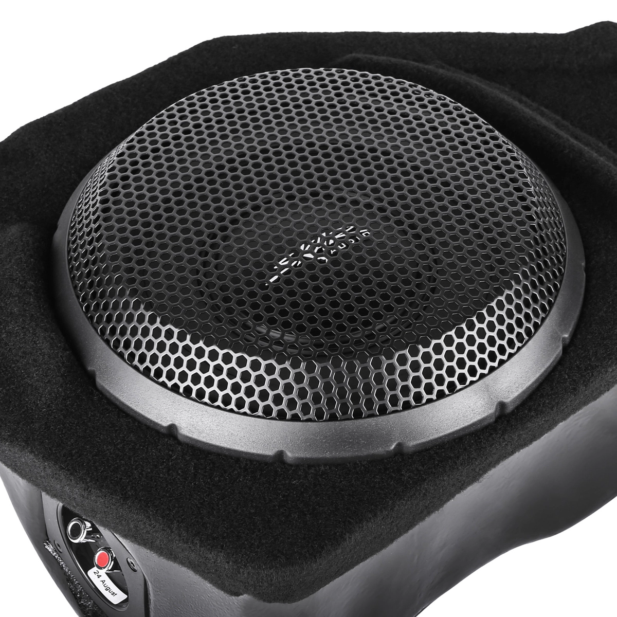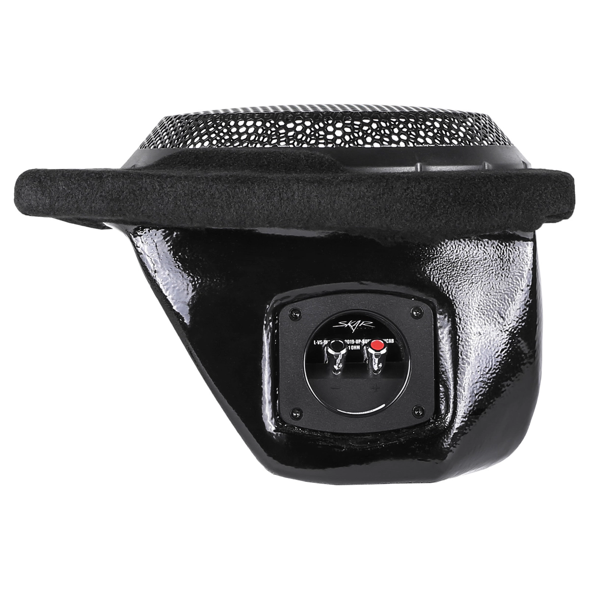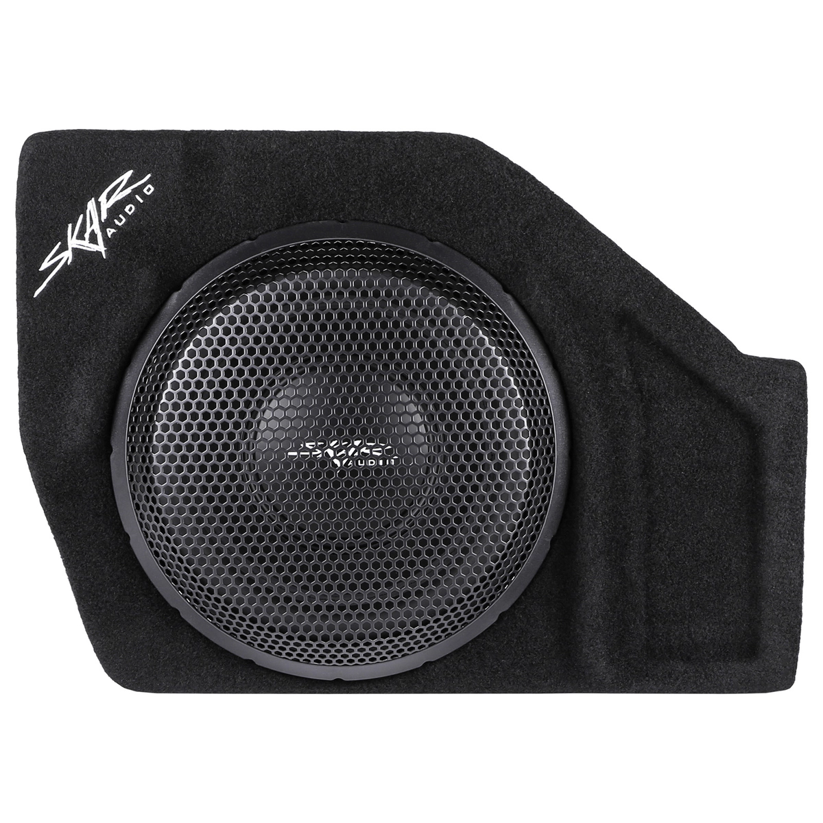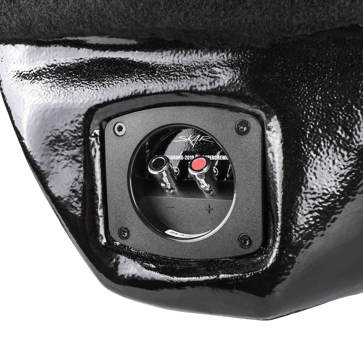 Crafted from high-quality materials, this enclosure is designed to fit seamlessly below the rear seat of the SuperCrew Cab. Its up-firing design ensures world-class bass output without sacrificing valuable cabin space. The enclosure features Skar Audio's exclusive 1,000-watt max power shallow mount subwoofer, pre-loaded and wired internally to a 1-ohm final impedance at the speaker terminal wiring cup.