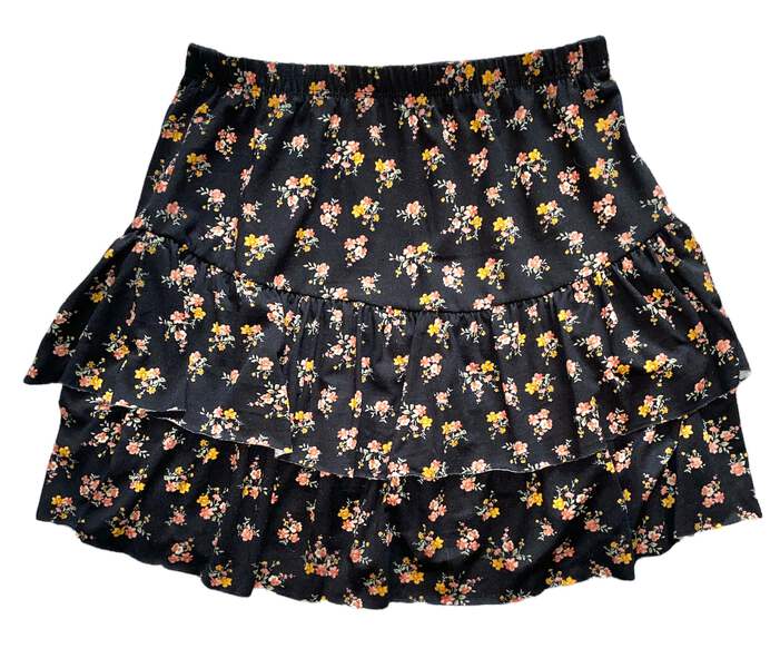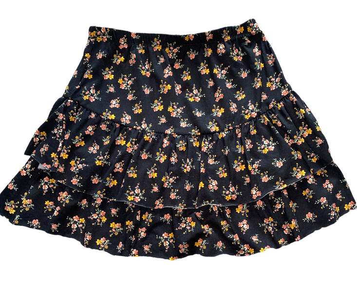 Cheryl Creations Kids girls soft black ruffle mini skirt in beautiful floral print and elastic waist size XL(16).