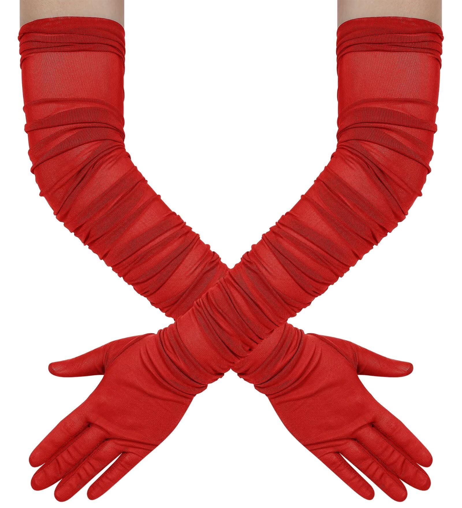 Women's Super Long Stretchy Ruched Mesh Tulle Sheer Gloves Costume Opera Party 1920's Dance Gloves Red