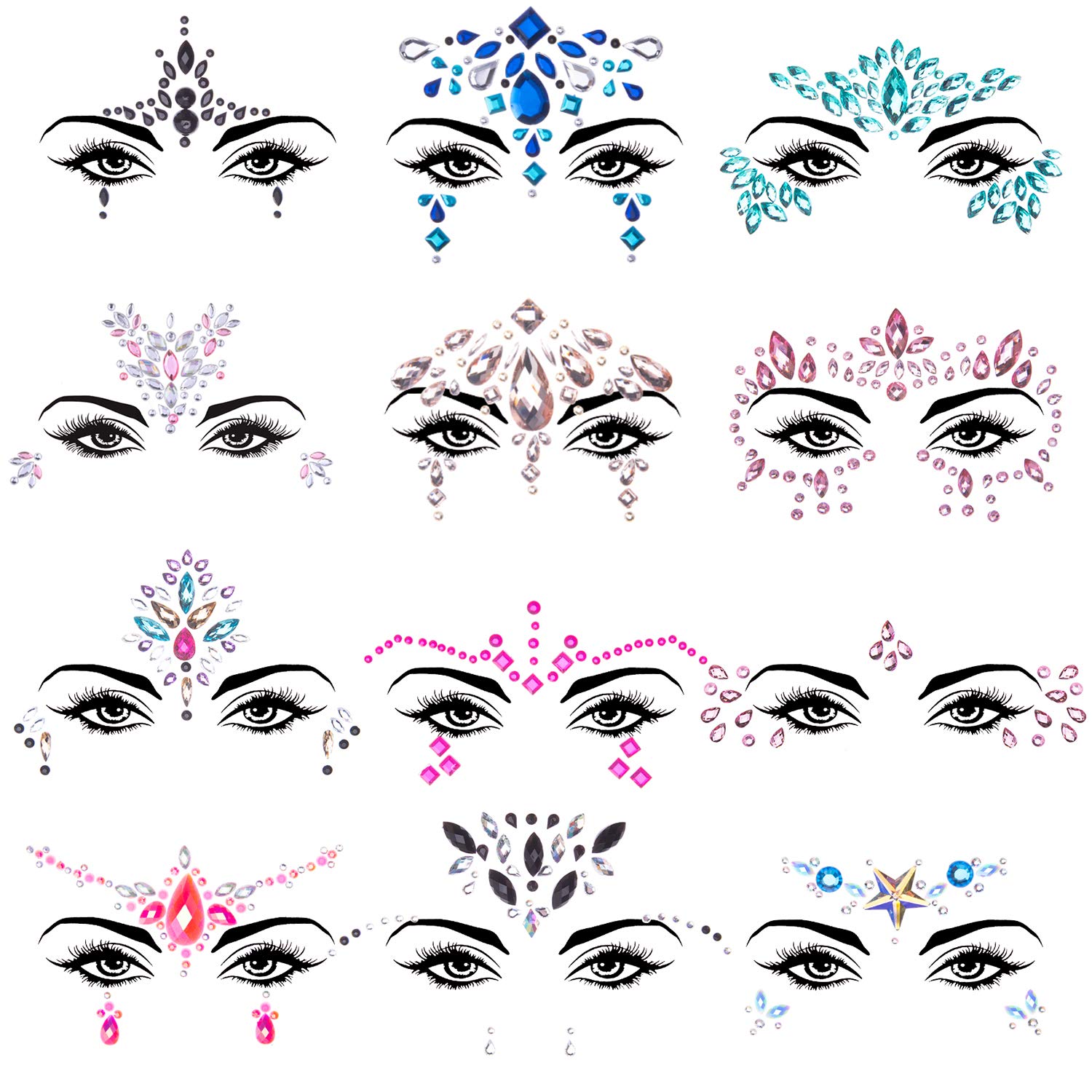 Outstanding design:the face jewel stickers consist of many different size and shapes rhinestones, create 12 different patterns, twinkling and attractive