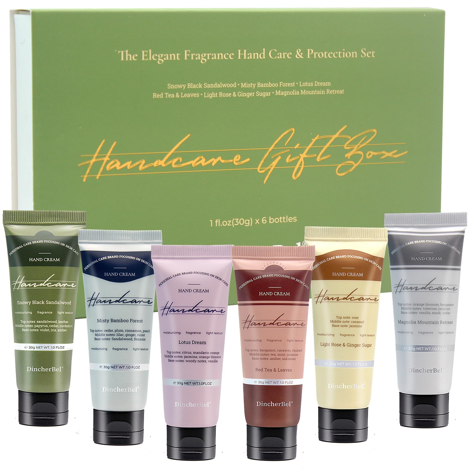 6Pack Hand Cream for Dry Cracked Hands: Snowy Black Sandalwood, Misty Bamboo Forest, Lotus Dream, Red Tea & Leaves, Light Rose & Ginger Sugar, and Magnolia Mountain Retreat. While moisturizing your hands, it will bring you a pleasant olfactory enjoyment and make you feel more comfortable