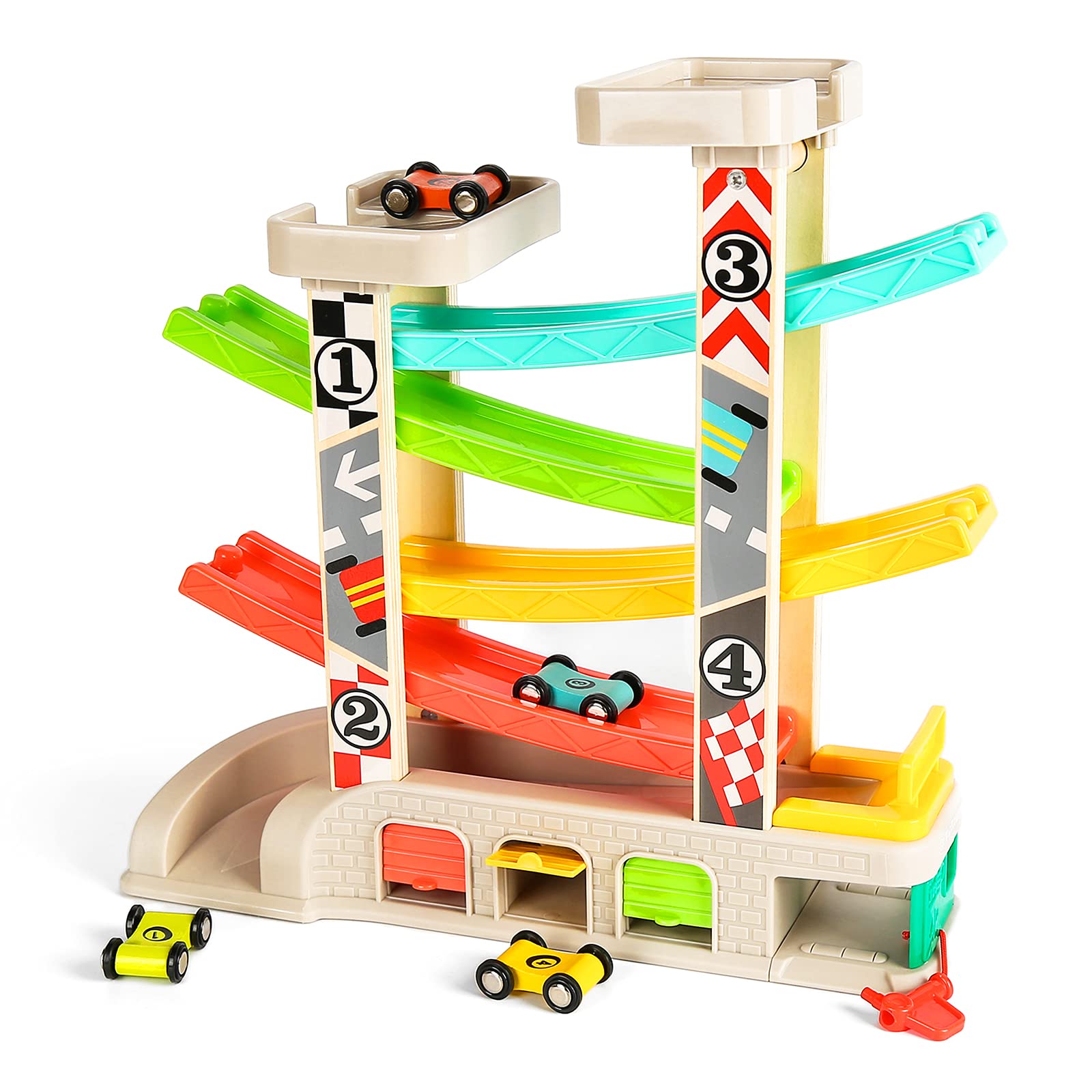 Parking Lot, Easy to : Toddlers can the wooden cars in the related car garages with doors by themselves which helps improve toddler’s sense of storage and learning color matching, also prevent the cars from getting lost.Best Birthday, Holidays (Christmas, Halloween, Thanksgiving New Year) Gifts for boy girl 2 3 4 year olds