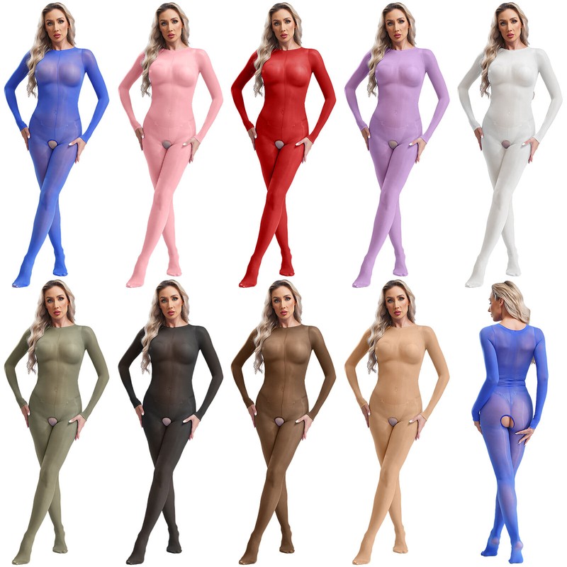 See-through lingerie bodysuit adds mystery sense to your hourglass figure, and brings glossy look because of the oil-shiny fabric.