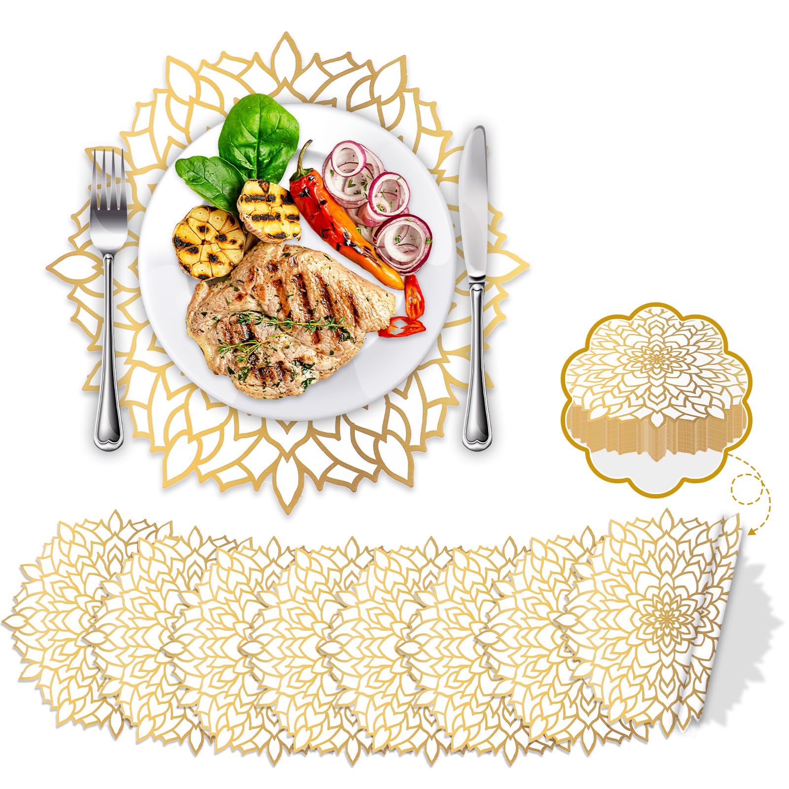 【Package includes】You will receive 60 pieces of Disposable Gold Metallic Round Paper PlaceMats,Double-sided printing,Measuring 13''x13'',lightweight and portable, that can sufficient for party or daily use and demands.