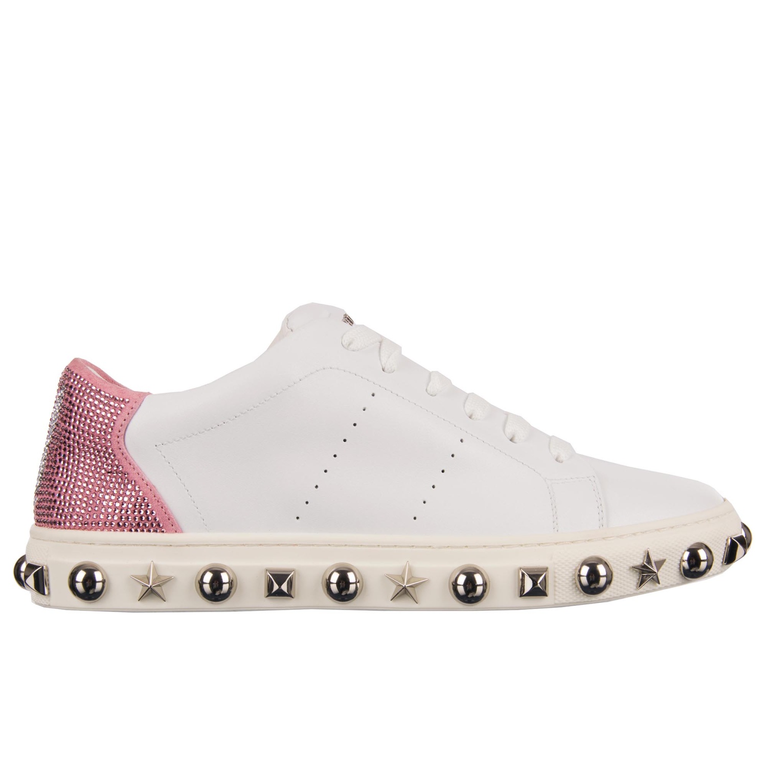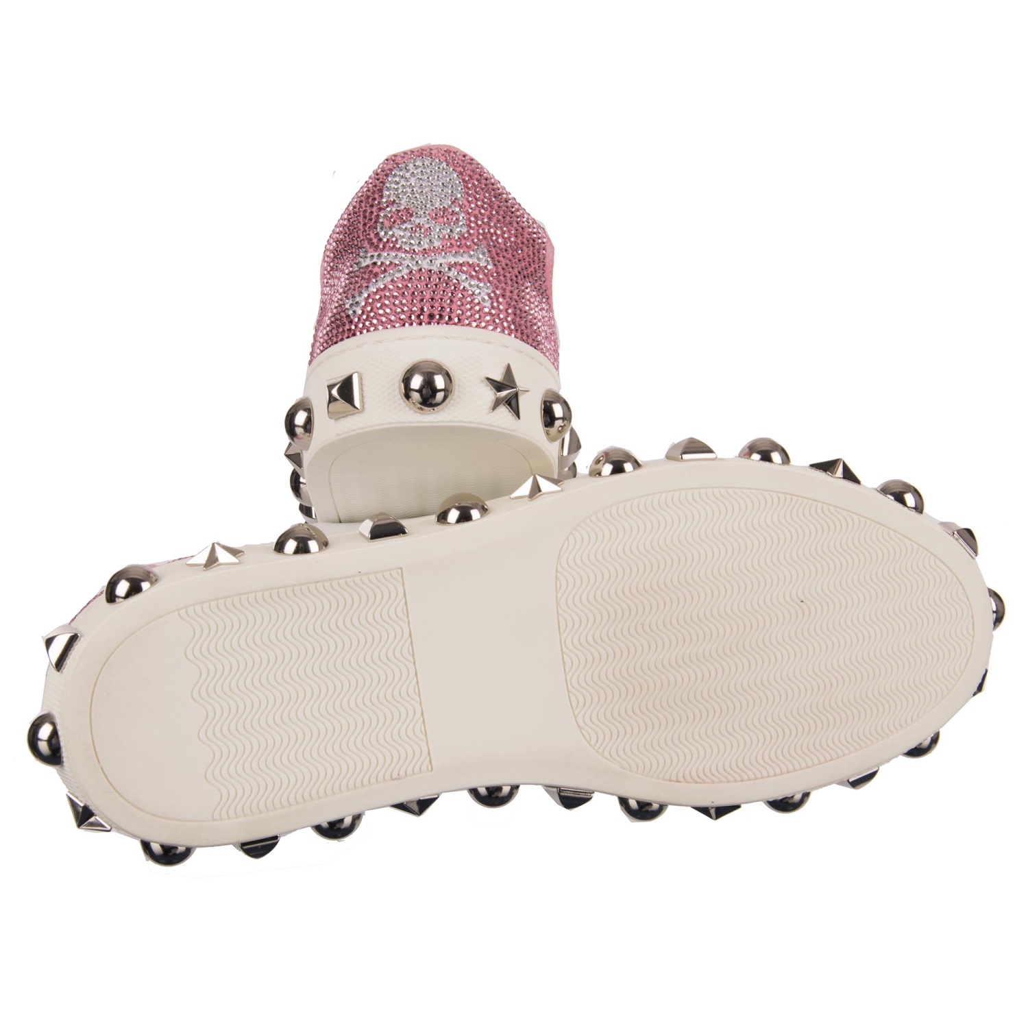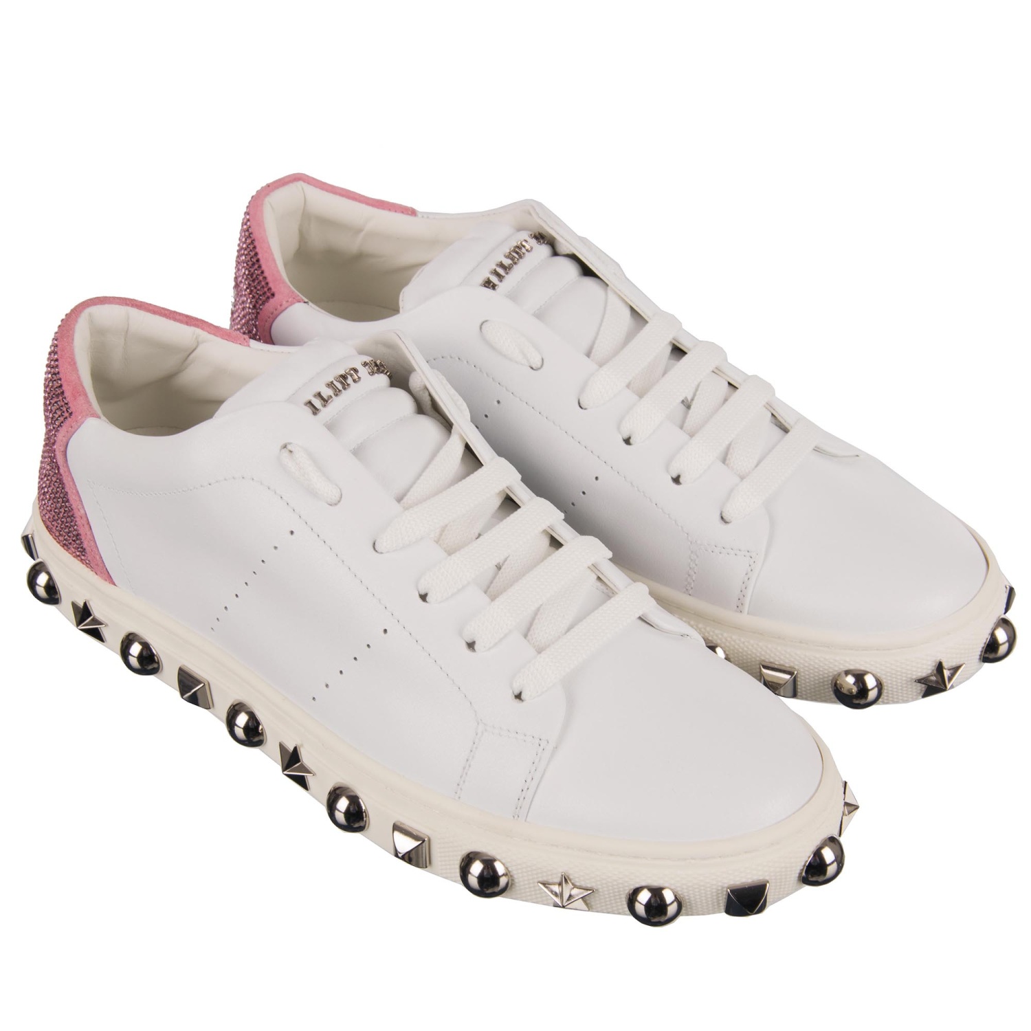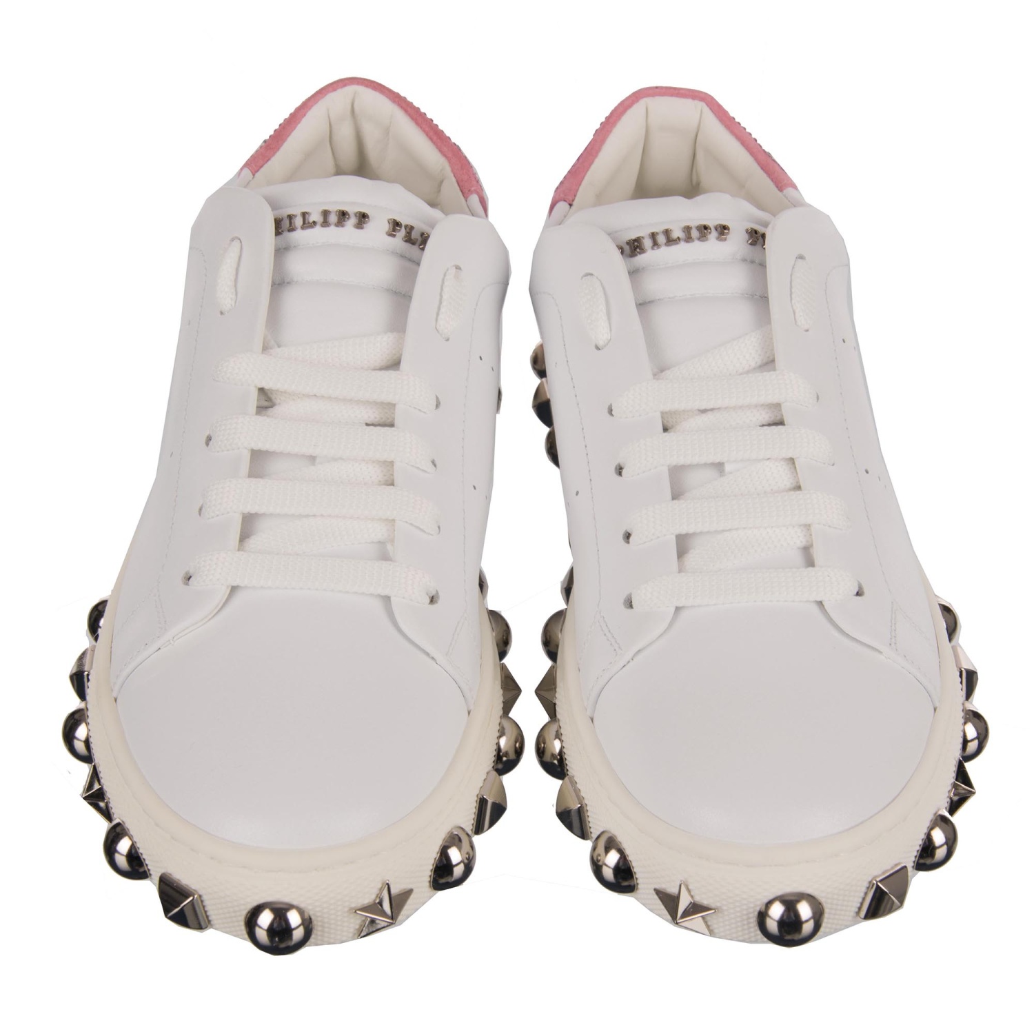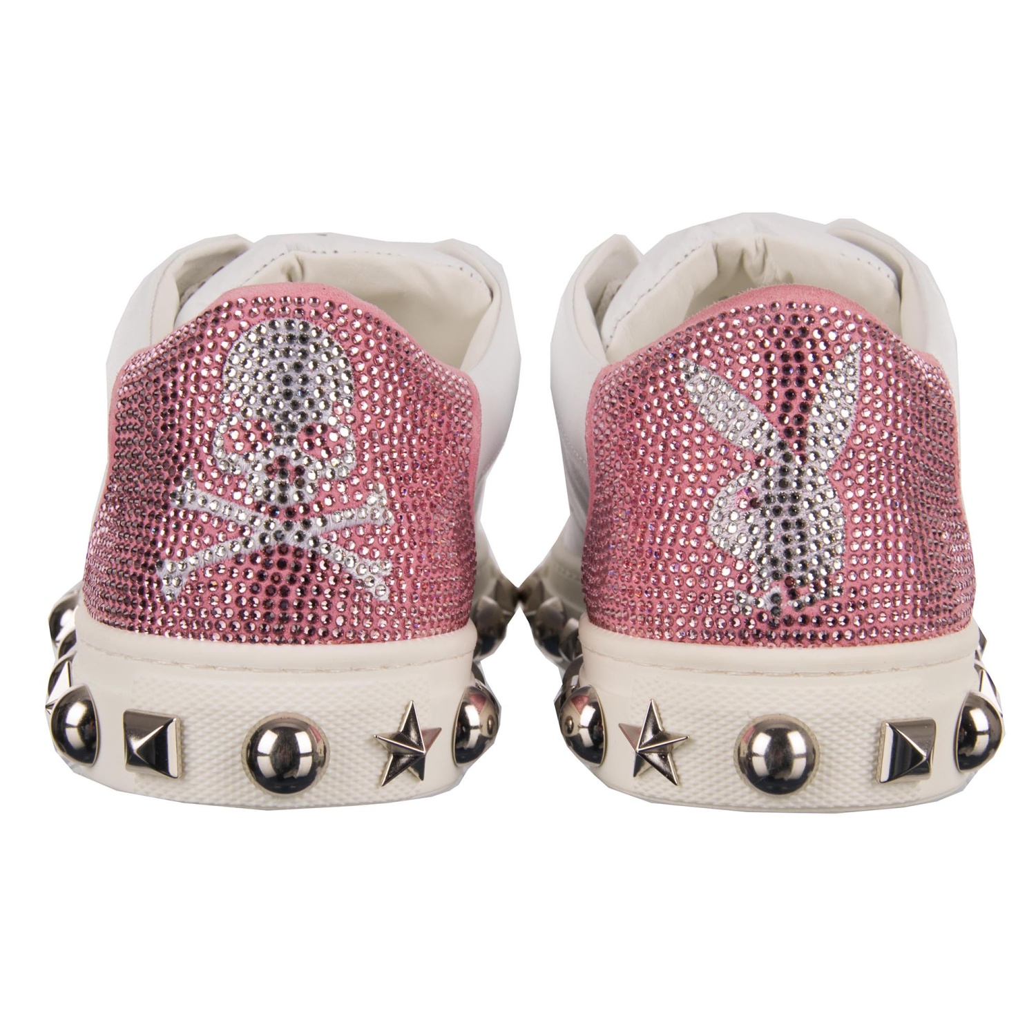 - Women Low-Top Sneaker in white and pink with crystals embellished Plein and Playboy logos, studded sole and tongue with Philipp Plein metal logo by PHILIPP PLEIN X PLAYBOY