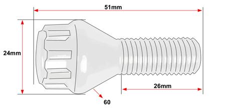 Specifications Thread size: M12 x 1.5 Thread length: 26mm Overall bolt width: 24mm Overall bolt length: 50mm (inc the head) Seat type: Tapered (Cone shaped) Bolt material: Heat treated carbon alloy steel Bolt finish: Black Spanner size: 17mm Hex Payment