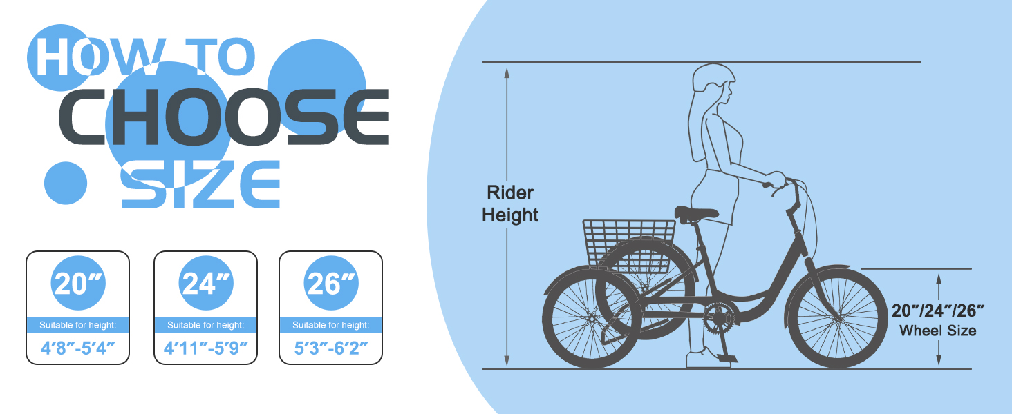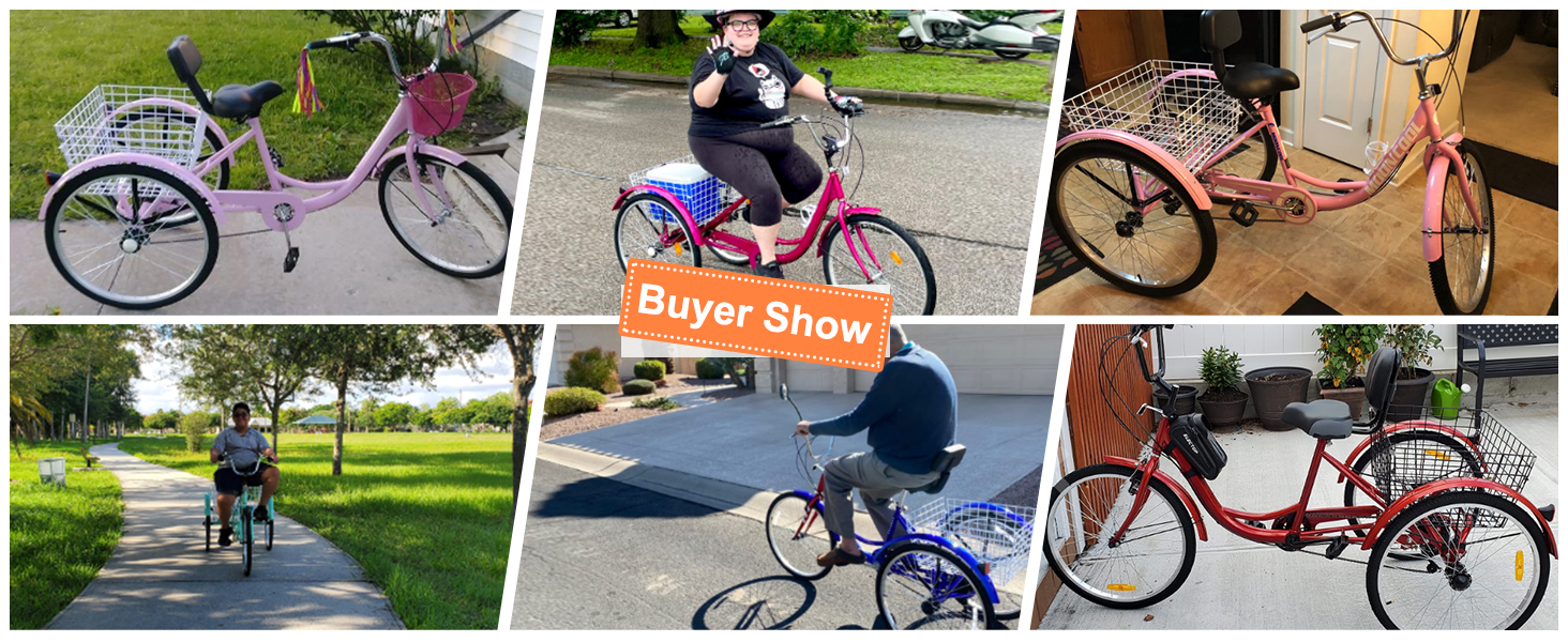 【High Quality Material】:The 3-wheeled bike is made of aluminum, and it can support rider and cargo combined weight up to 350 lbs. 24" wheel suitable for rider height: 4'11" - 5'9"