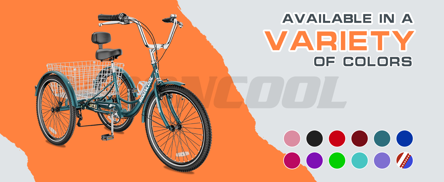 The Mooncool Adult Tricycle is a versatile and practical choice for everyday use. Crafted with a durable aluminum frame that can support up to 350 lbs, this 7-speed tricycle features large wheels with stylish fenders to keep you clean and dry. The spacious rear basket provides ample storage for your shopping, picnic, or exercise needs. This tricycle is easy to assemble and offers a comfortable and smooth riding experience. Whether you're looking for a leisurely cruise, a shopping companion, or a way to stay active, the Mooncool Adult Tricycle is the perfect solution for your outdoor adventures. PLEASE MAKE SURE THE SIZE before purchasing: 24" wheel suitable for rider height: 4'11" - 5'9"。