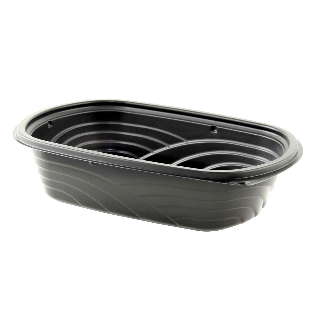 Microwavable container with smooth side ergonomic design for ease of use. Eye-catching WAVE pattern with spoon-able inside surface and shiny black outside attract impulse buyers. Attractive, table-ready container in cut-resistant polypropylene material made with 40% less petroleum-based resin. Leak-resistant closure prevents messy spills and stackable design preserves the food presentation. Bases and polypropylene dome lid withstand temperatures to 230â in warming unit, under heat lamps, or in the microwave. RPET dome and flat lids sold separately for optimal food visibility on chilled displays. All products are recyclable curbside.