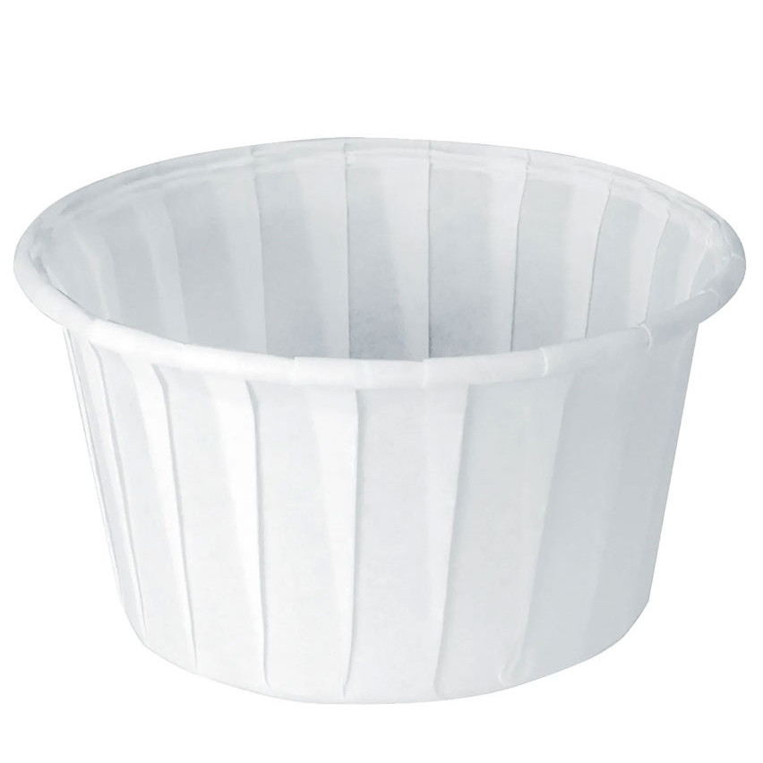 Paper Souffle Cups have tightly rolled rims and box pleats keep our paper portion cups regarded as the best in the industry. Our pleated paper portion cups are designed for durability. Due to the tightly wound rims and recessed base, our portion cups help prevent tipping or spilling on countertops. A convenient option for dine-in food presentation, especially for condiments. Tightly rolled rims increase cup rigidity. Box pleats increase strength of portion cups. Multi-color printing available on cone water cups