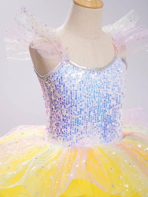 The bodice is decorated with shiny sequins. Adjustable shoulder straps with tulle ruffles on the shoulders look cute.
