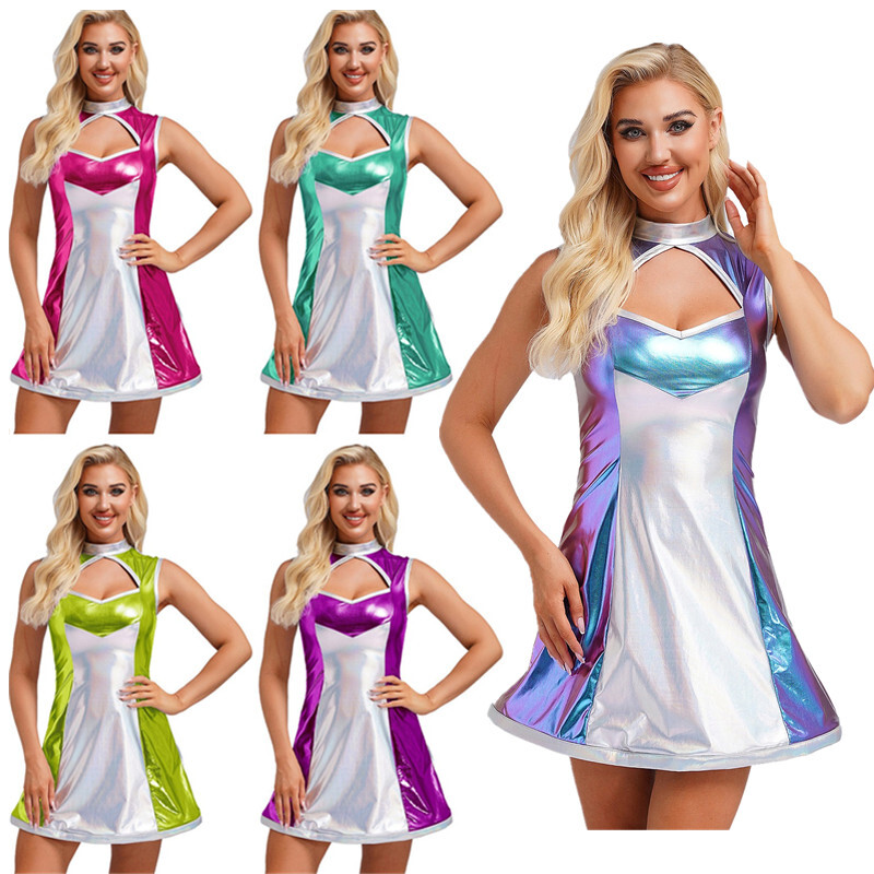 Metallic shiny fabric has unique luster and brings a very futuristic look. Contrast design makes a slim effect to make you attractive.