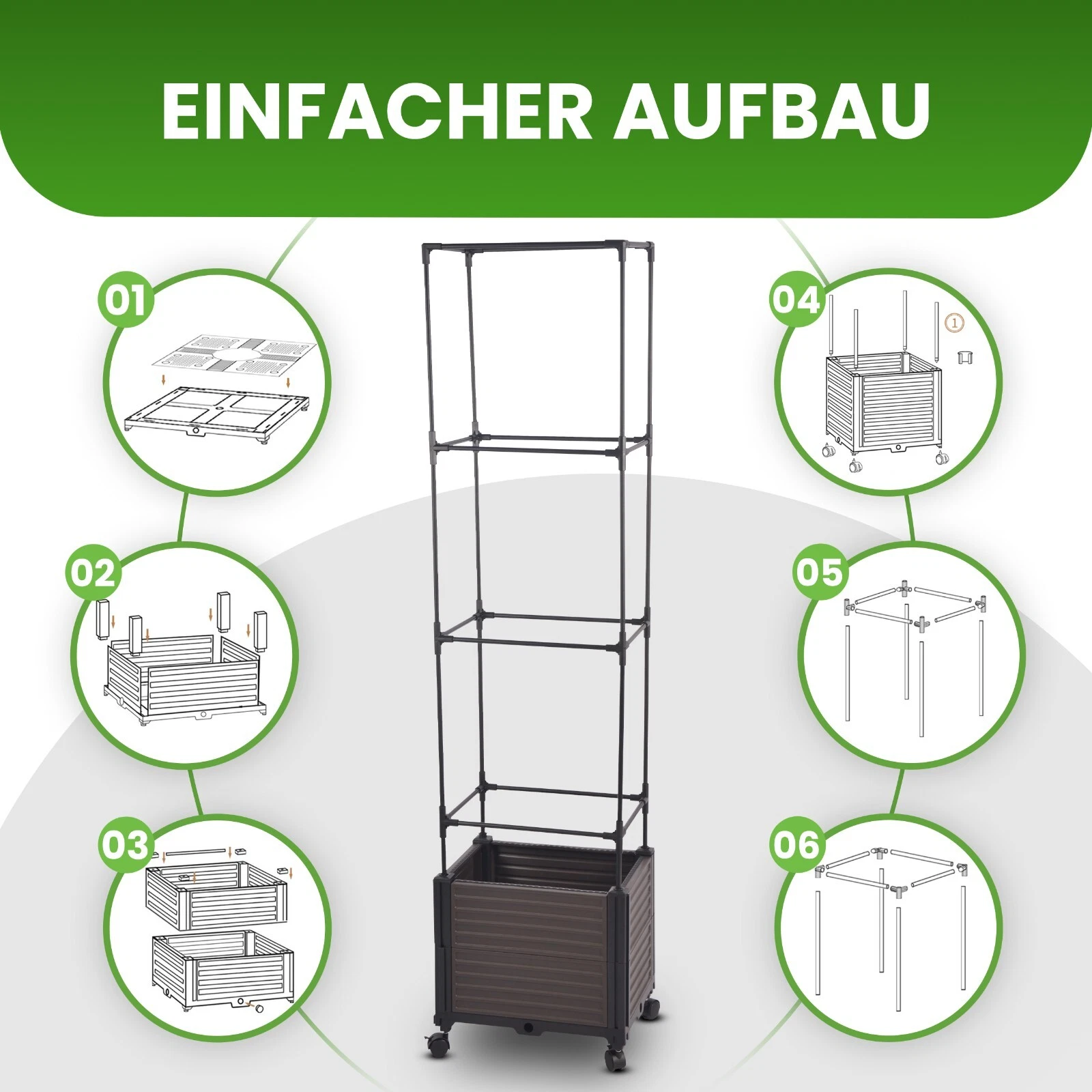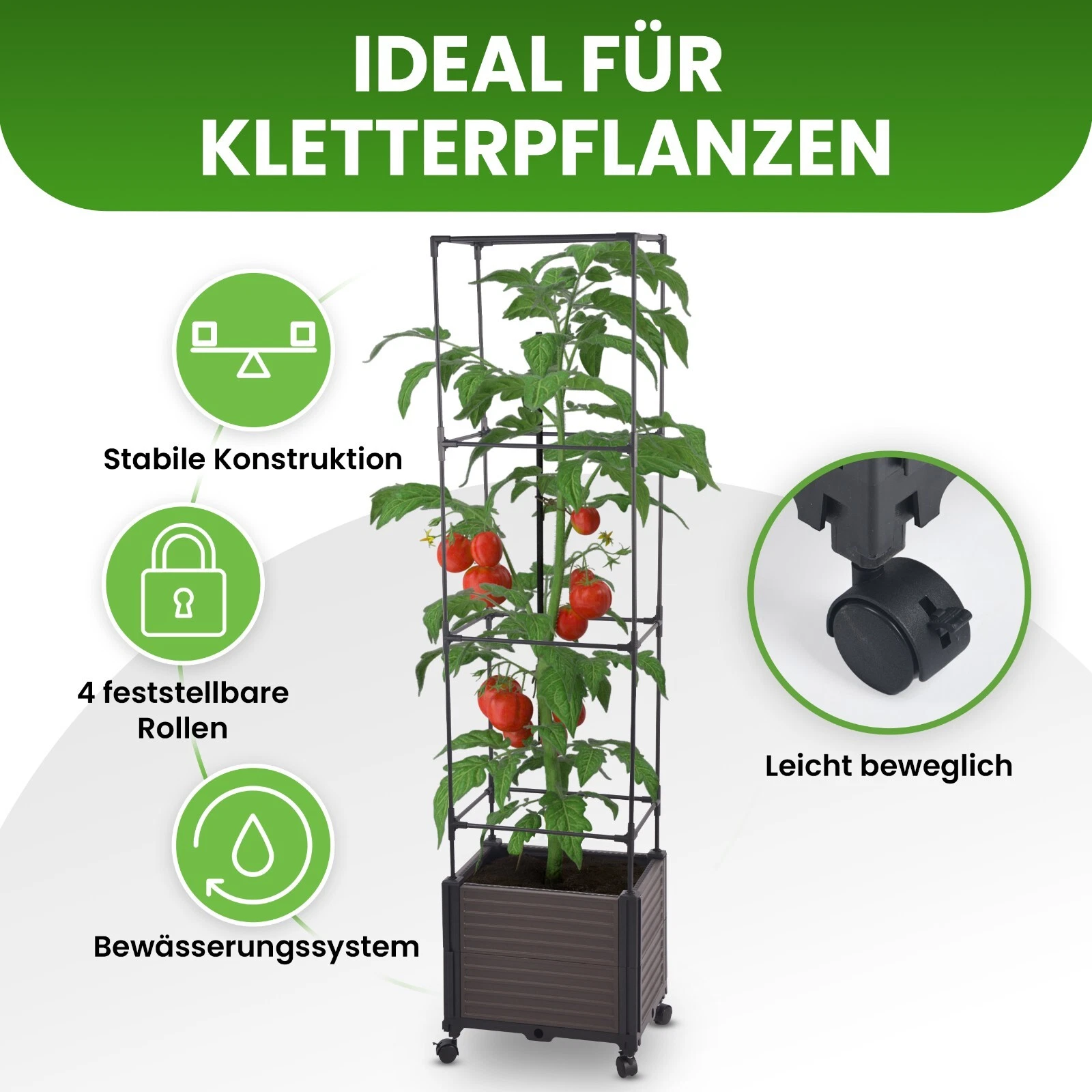 Dank der stabilen und robusten Ringklammern und der soliden Turmform ist der Kasten äußerst stabil und bietet den Pflanzen einen sicheren Halt, und dank der flexiblen Ebenen des Spaliers, lässt sich die Höhe individuell anpassen, sodass es mit dem Wachstum der Pflanze mitwachsen kann.
