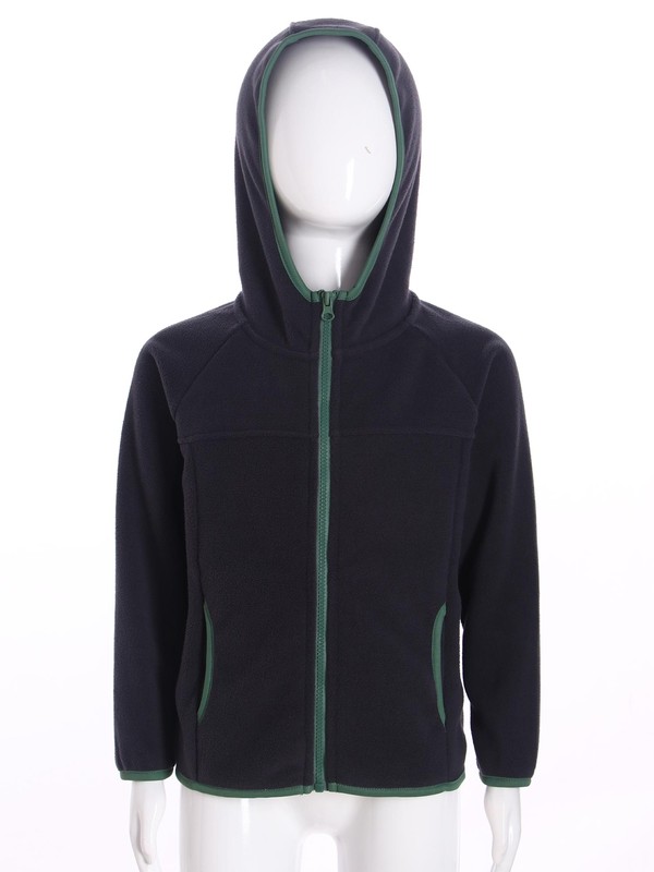 Casual fleece hooded jacket for kids with side pockets to hold the essentials and keep hands warm. Zipper closure allows for easy wearing.