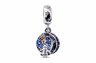 This double dangle features Santa sitting on a crescent moon hanging before a sparkling moon set with blue stones and raised silver stars. A 14k gold plated star hangs from the top of the moon casting a magical glow. Cut out stars and circles mix with embossed stars on the back of the moon. Glittering stones are also set into star shapes on the chunky silver bale which is engraved with the message Merry Christmas to all.