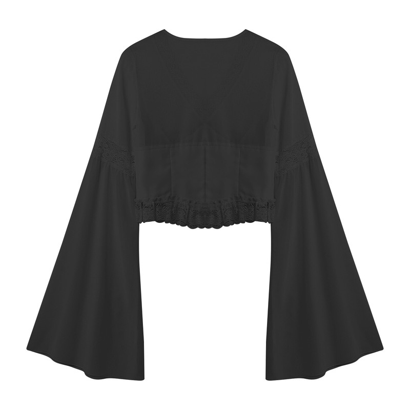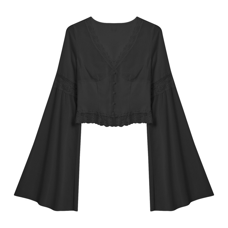 Designed with v neck, ultra long sleeve with bell bottom, floral lace trim and button decorations, solid color and cropped length.