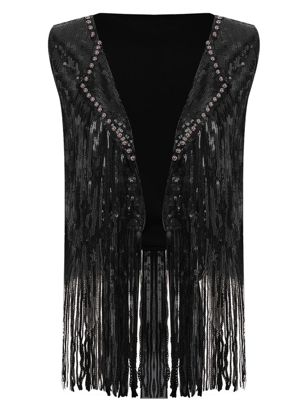 Designed with lapel, sleeveless, sequined fringe and vintage rivets, open front and solid color, this women’s cardigan looks stylish.
